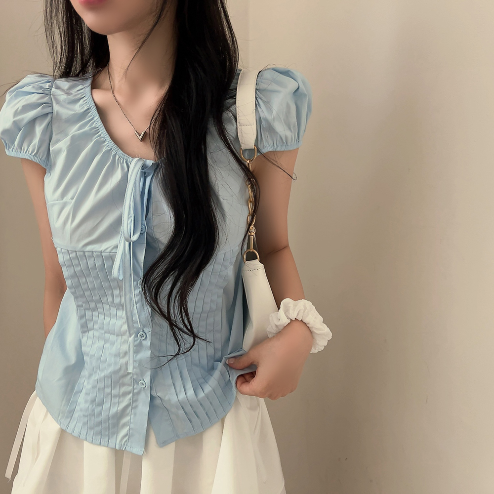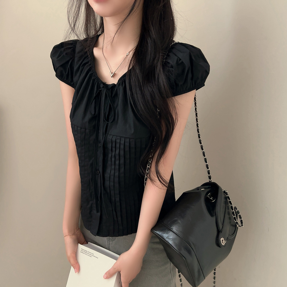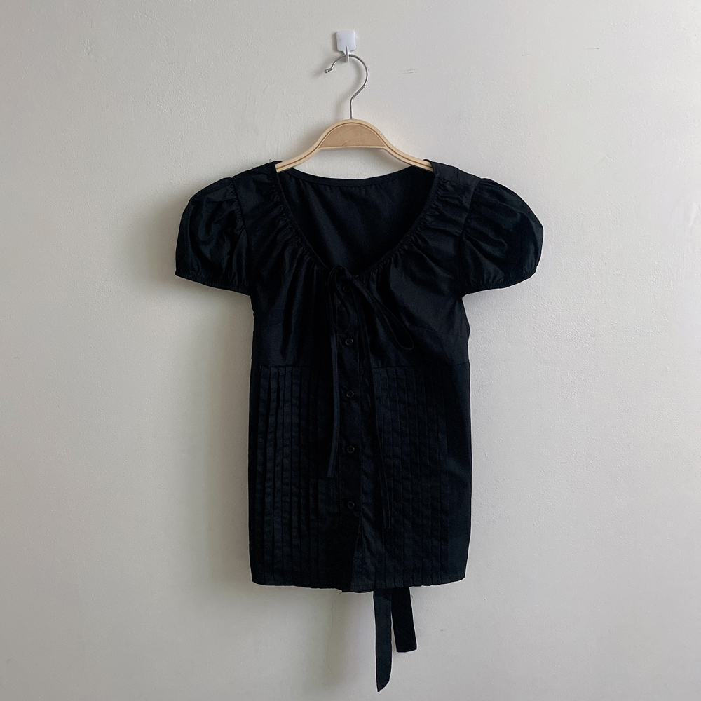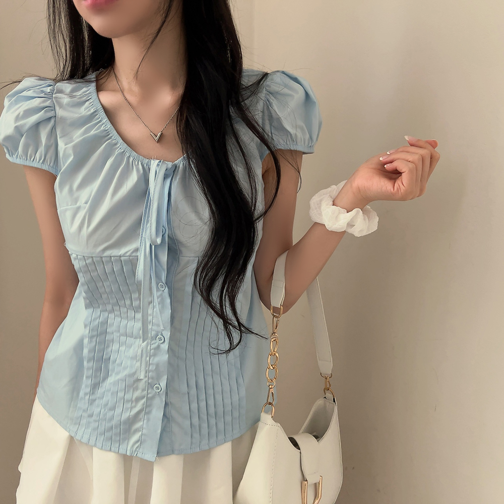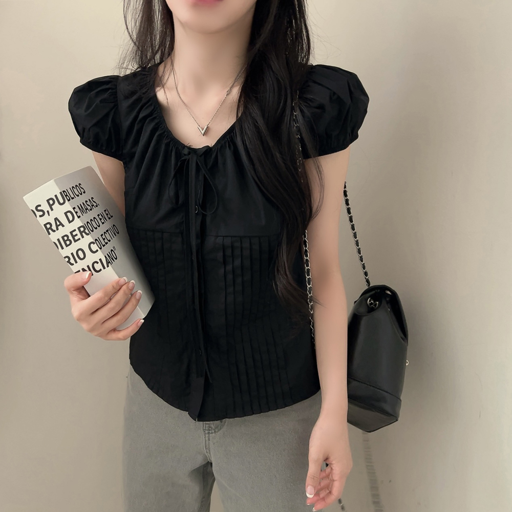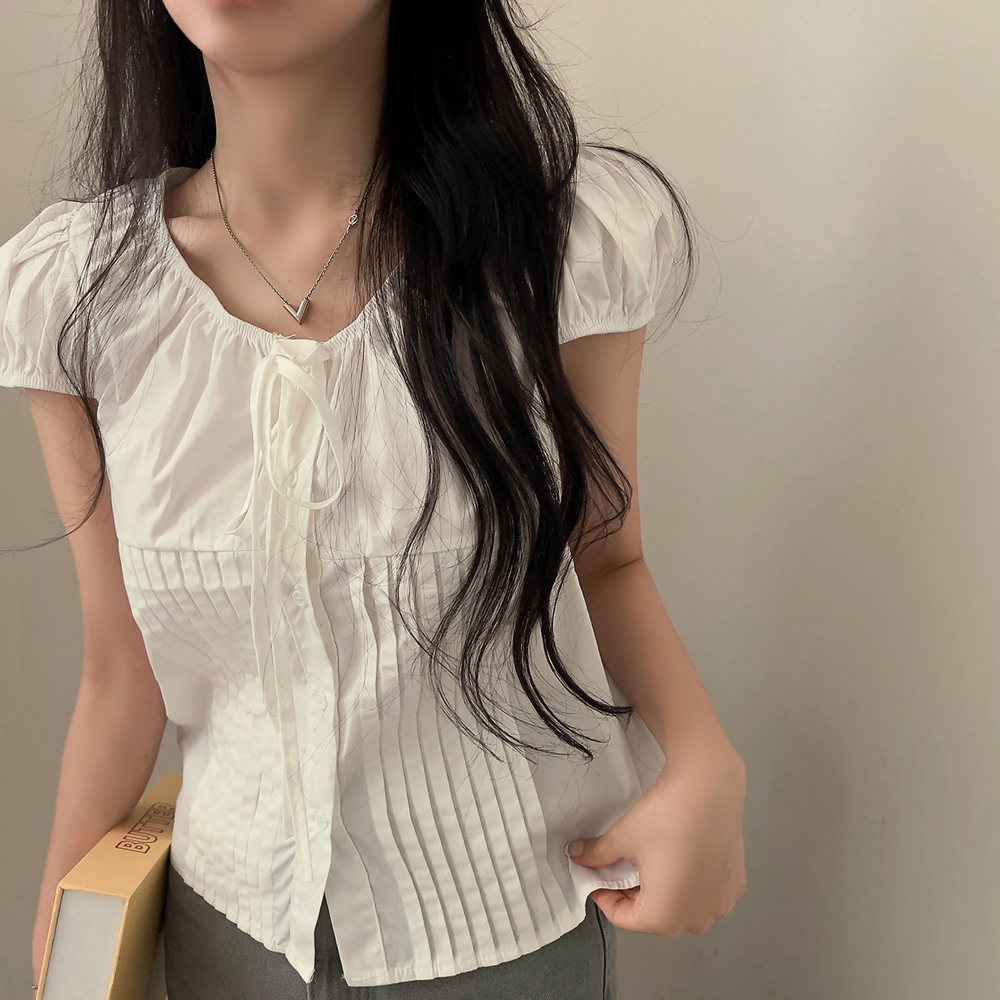 シャーリングリボンタック入りラウンドパフ半袖ブラウス