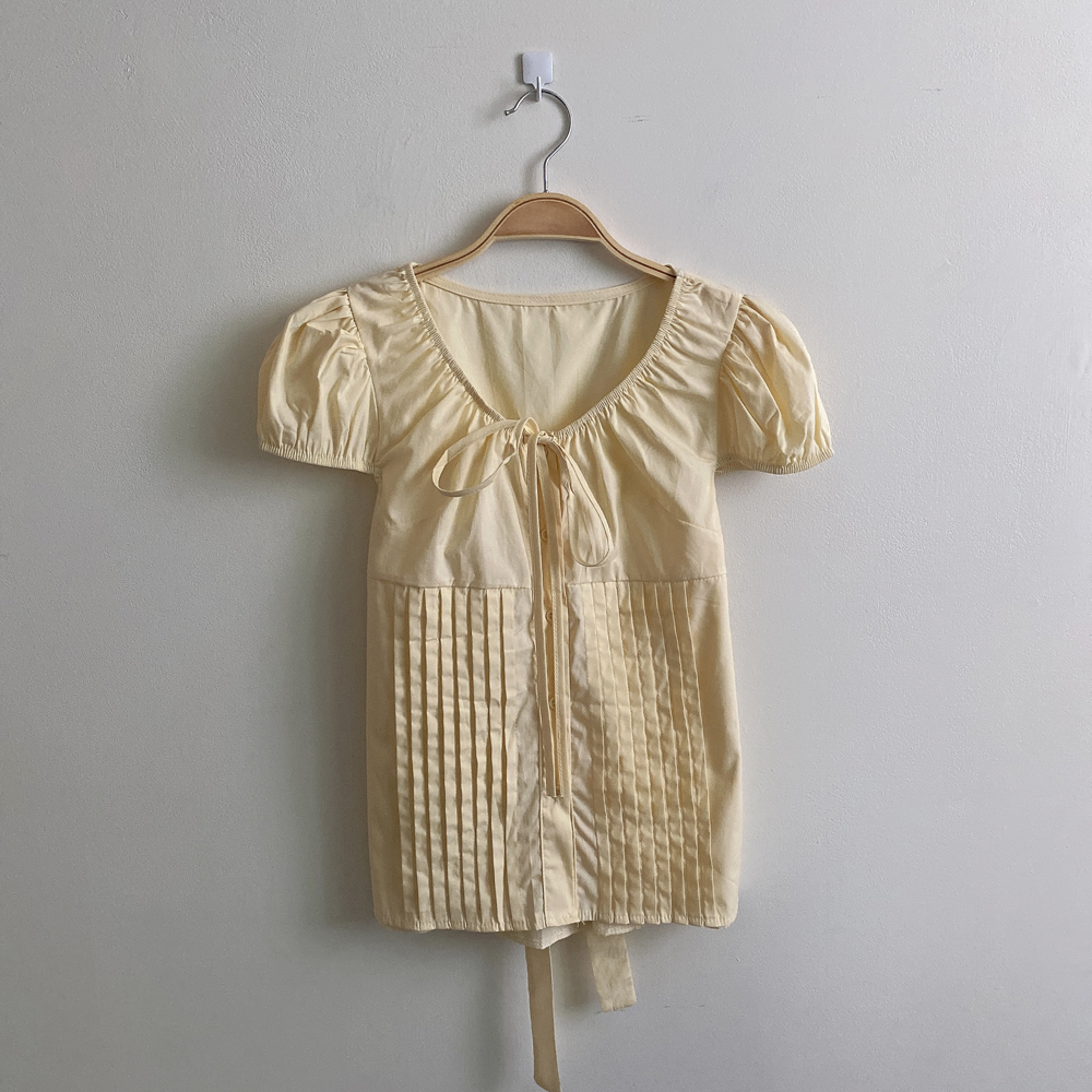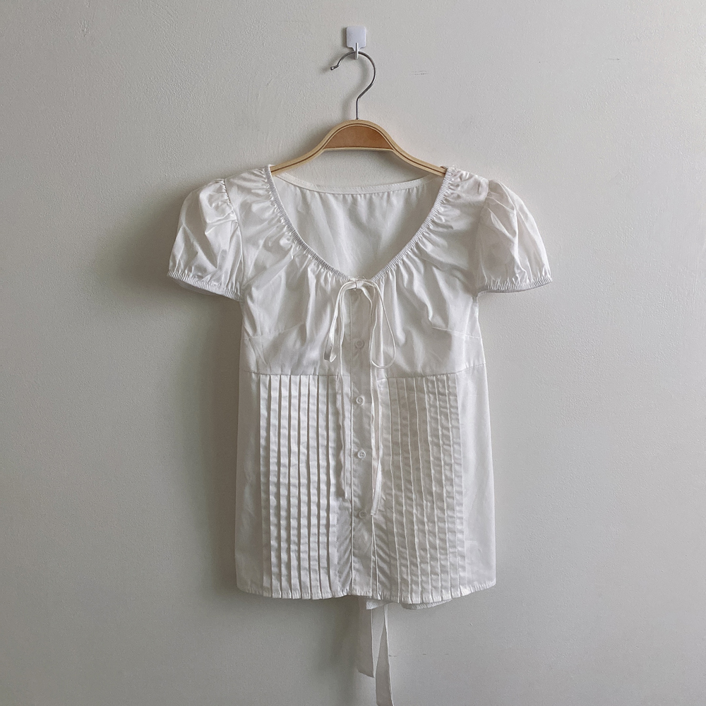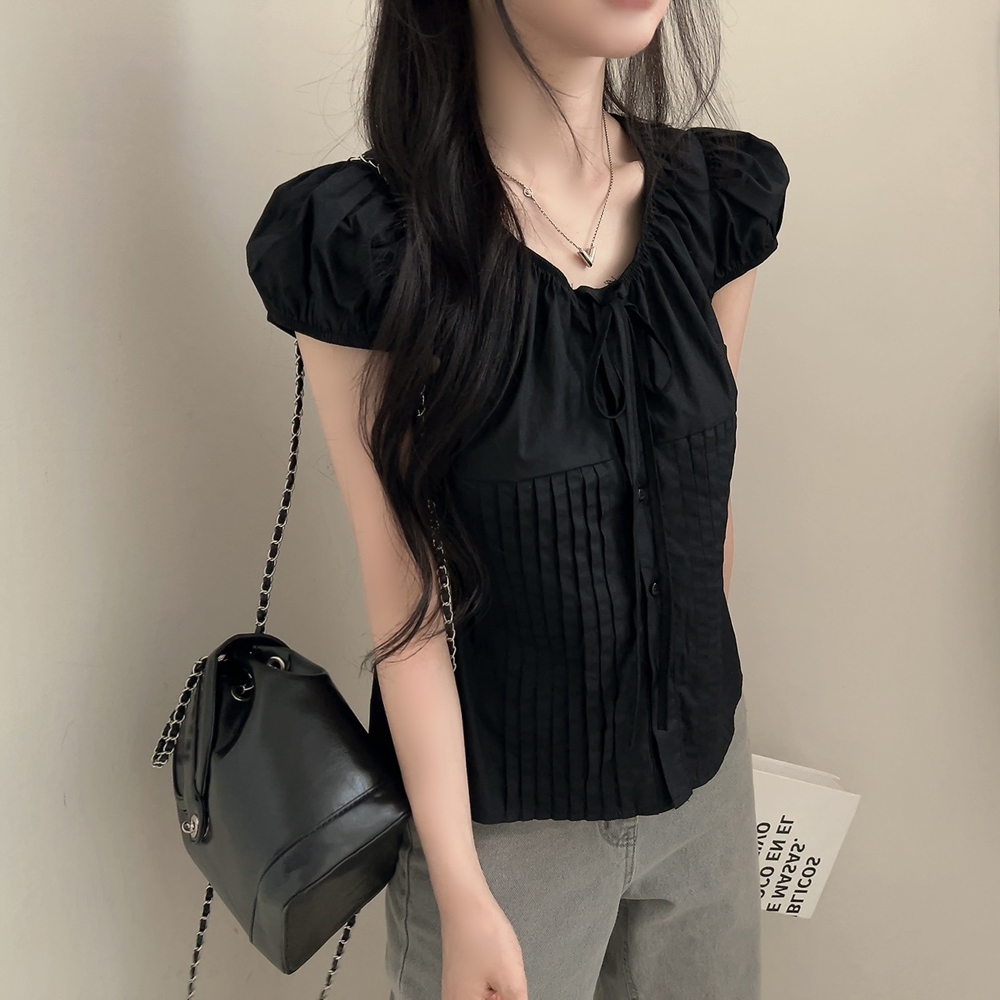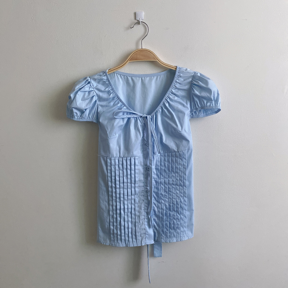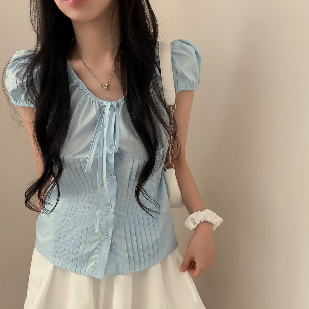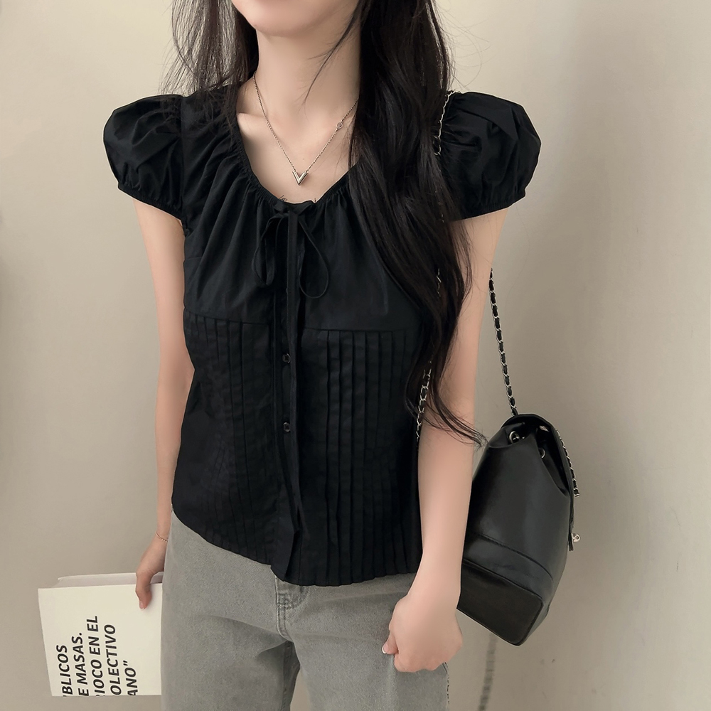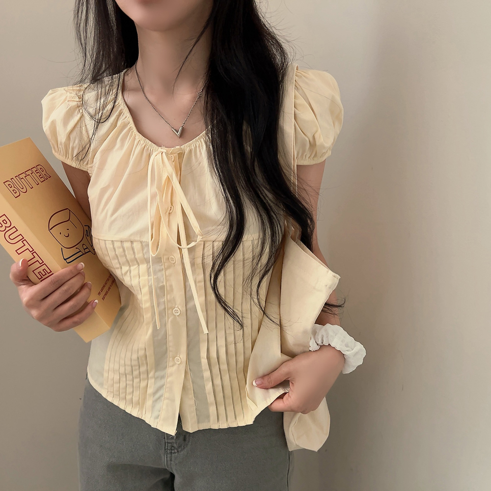 シャーリングリボンタック入りラウンドパフ半袖ブラウス