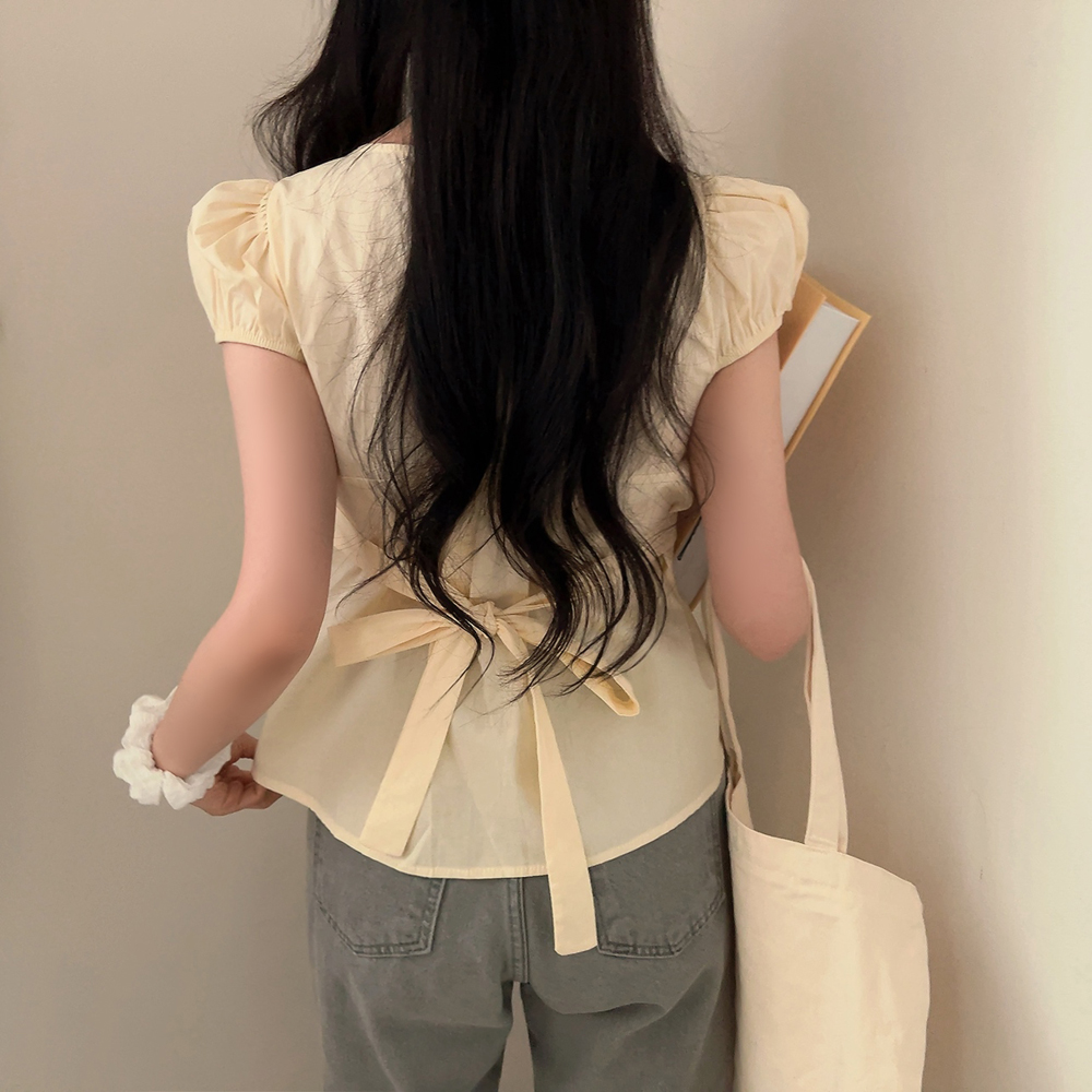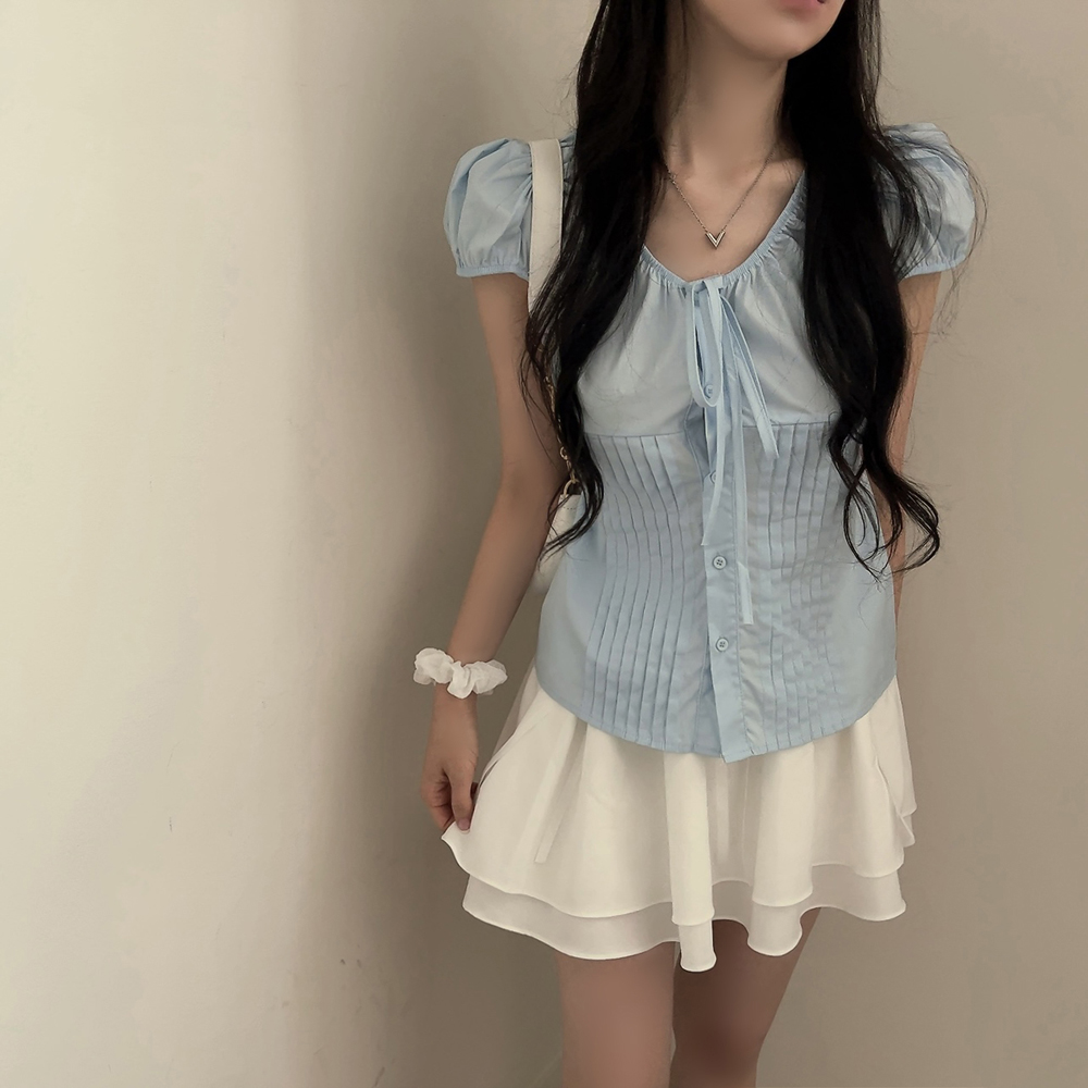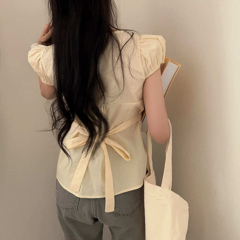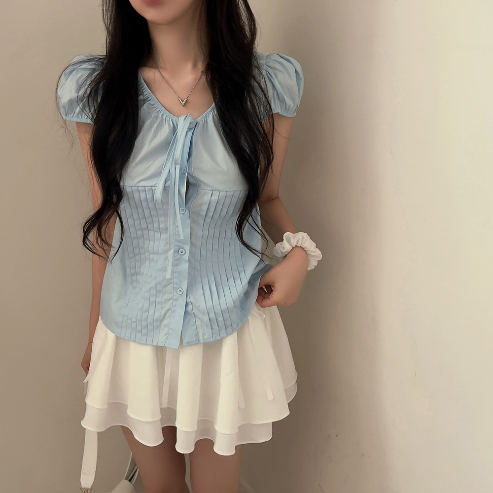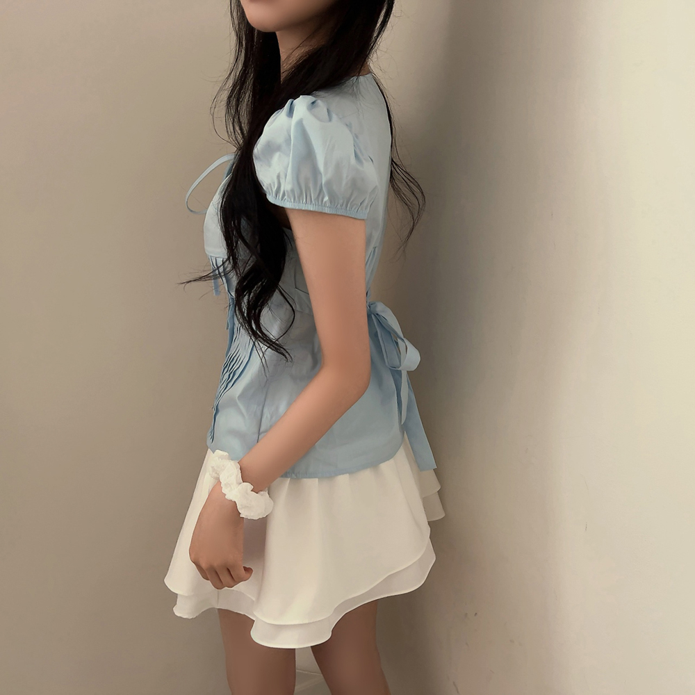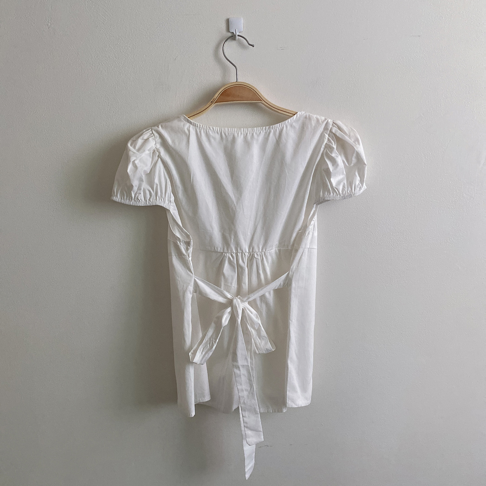 シャーリングリボンタック入りラウンドパフ半袖ブラウス
