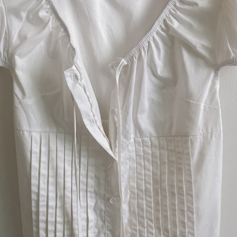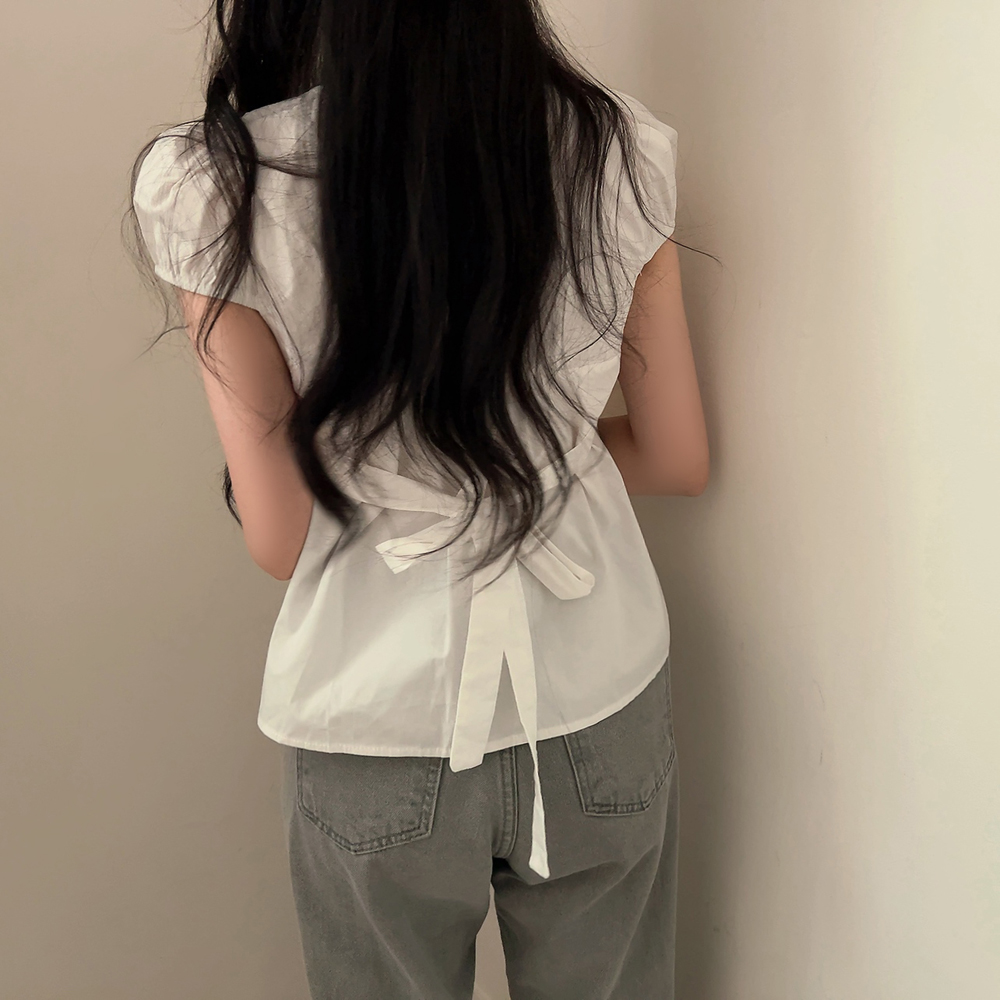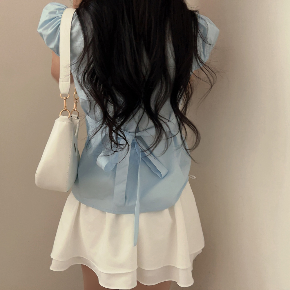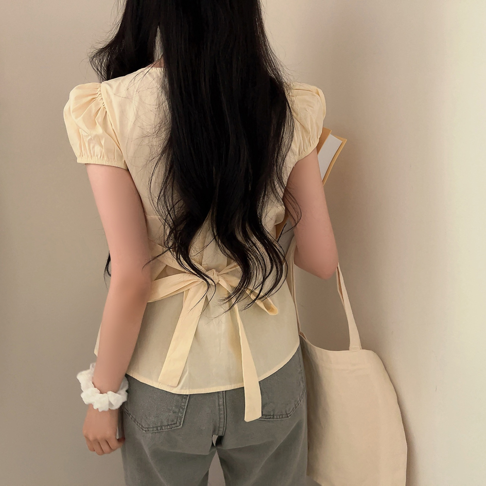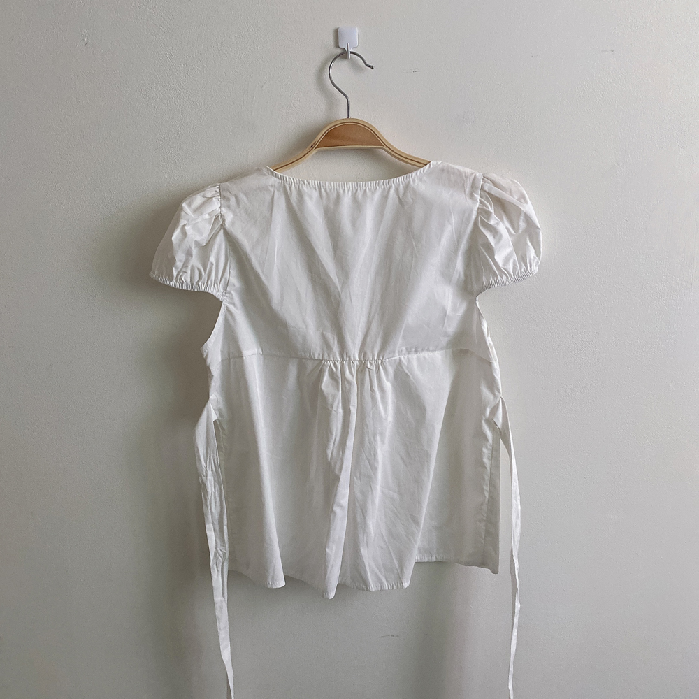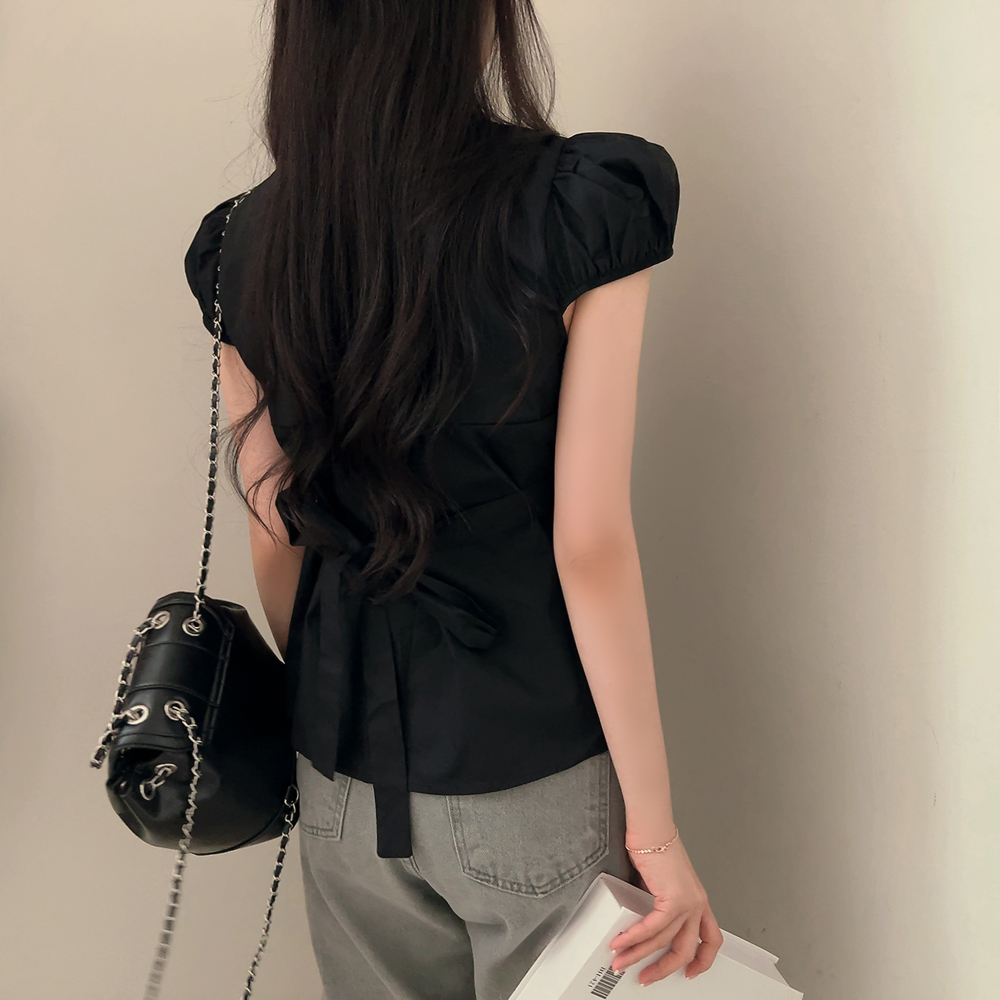 シャーリングリボンタック入りラウンドパフ半袖ブラウス