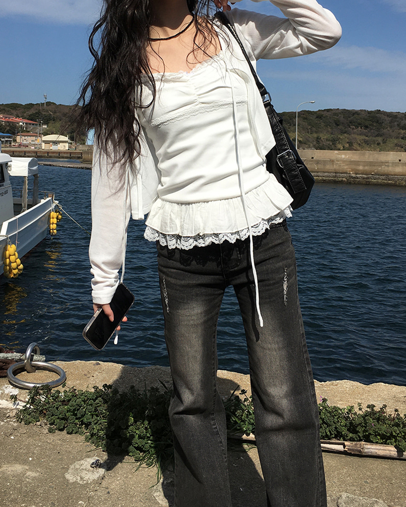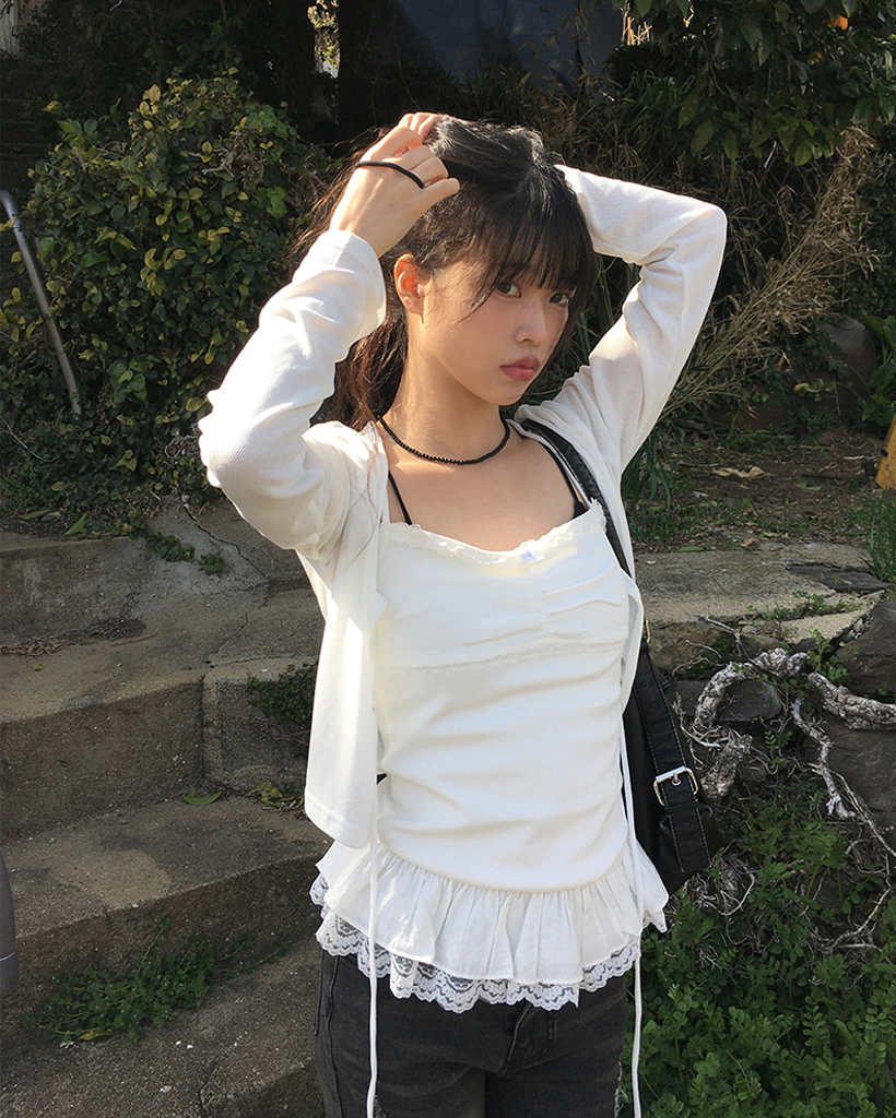 [お問い合わせ殺到/SET] 裾レースフリルキャミソール+リボンボレロ風カーディガンセット (2color)