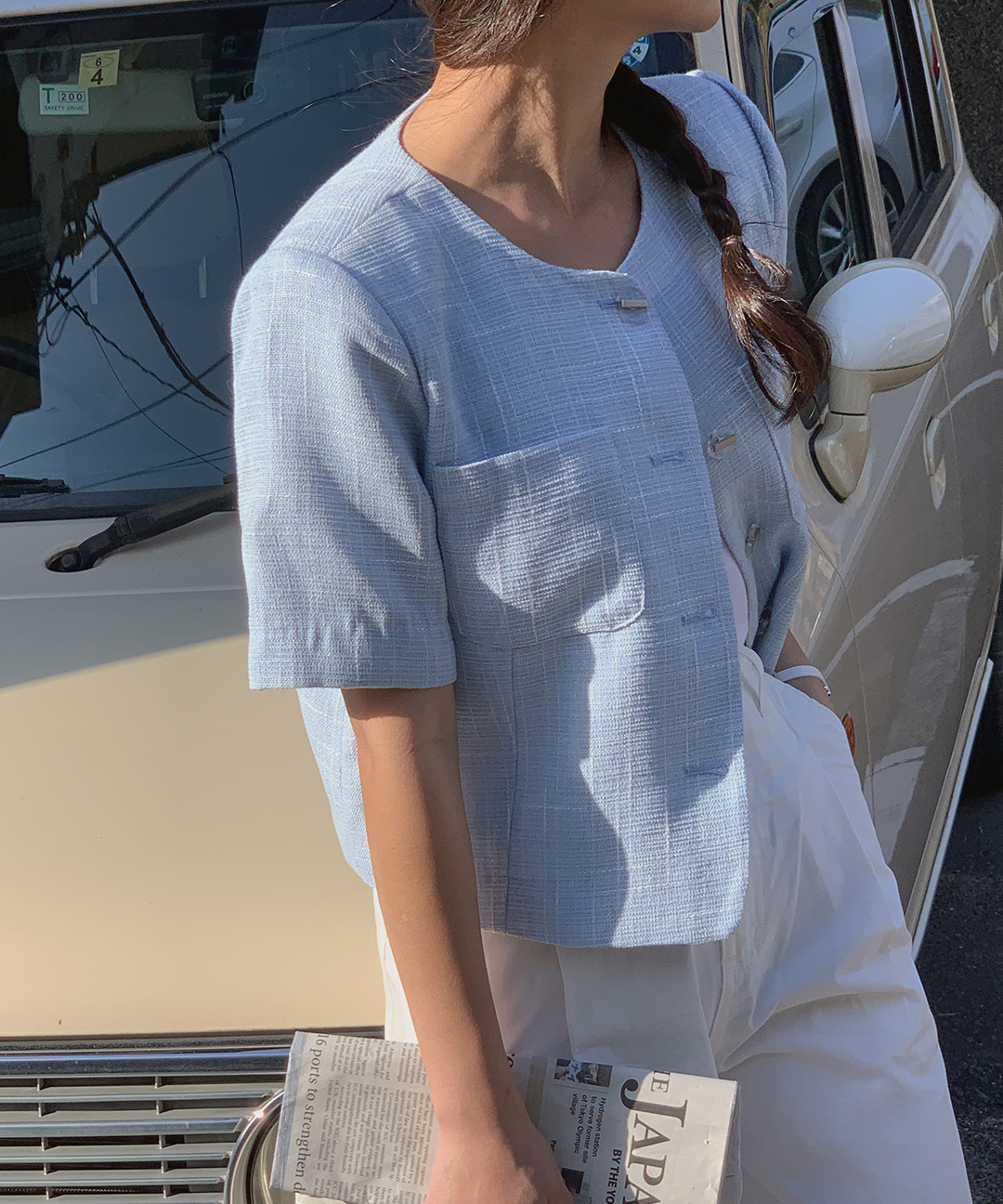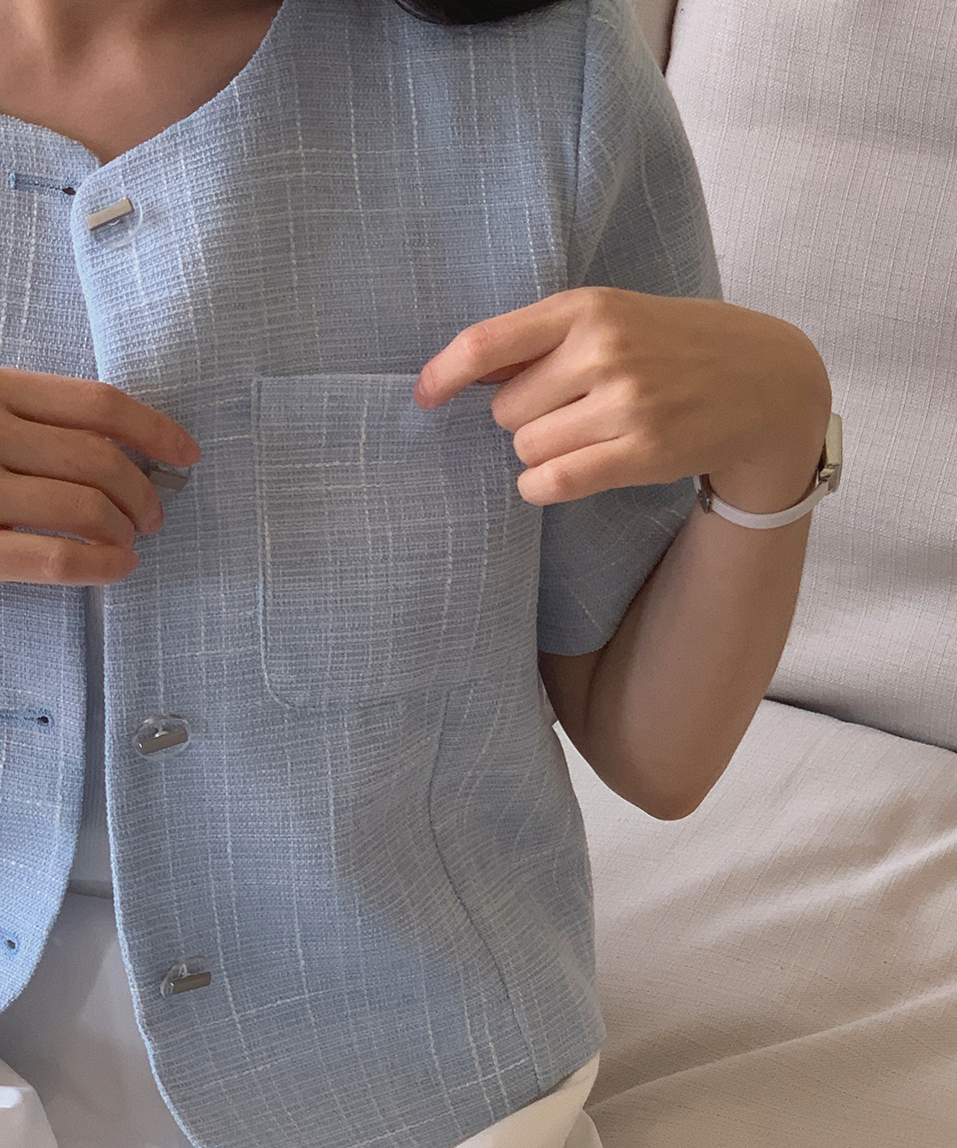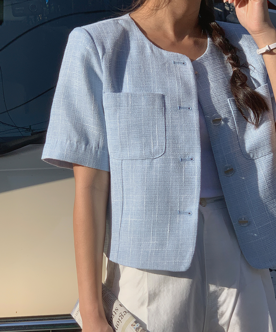 “夏でも着られるジャケット”は、軽やかで通気性の良いツイード素材を使用し、