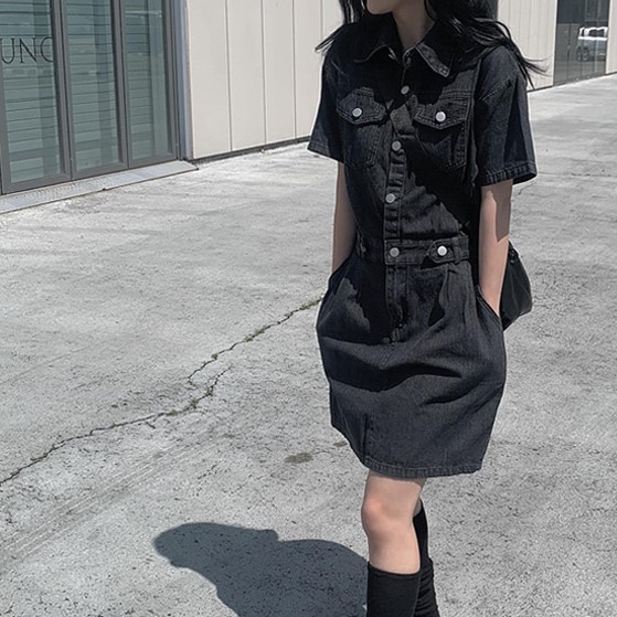 ガーリッシュなムードのブラックデニム半袖ワンピースです!