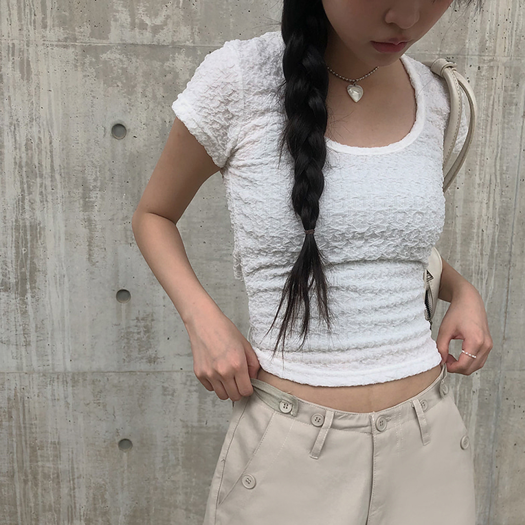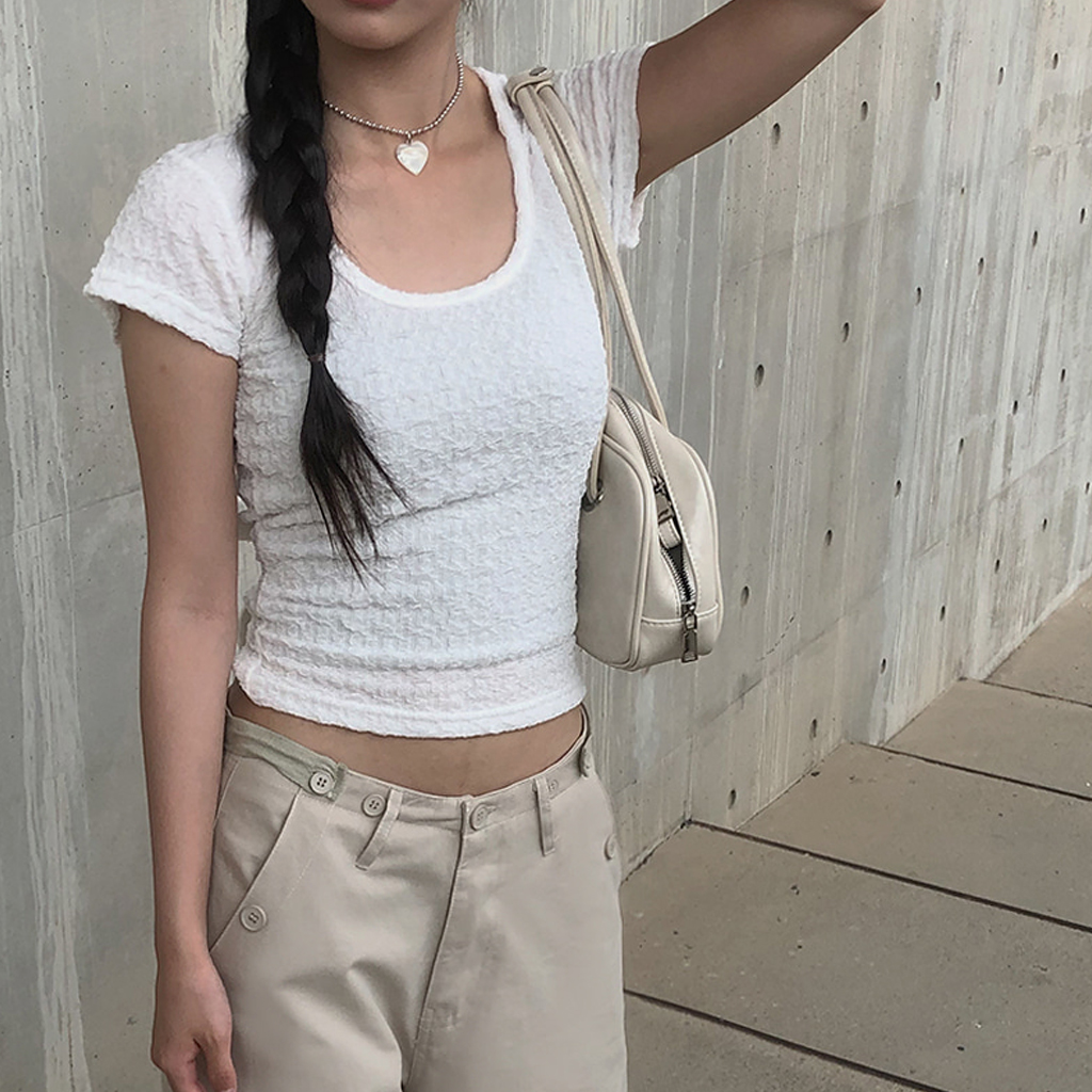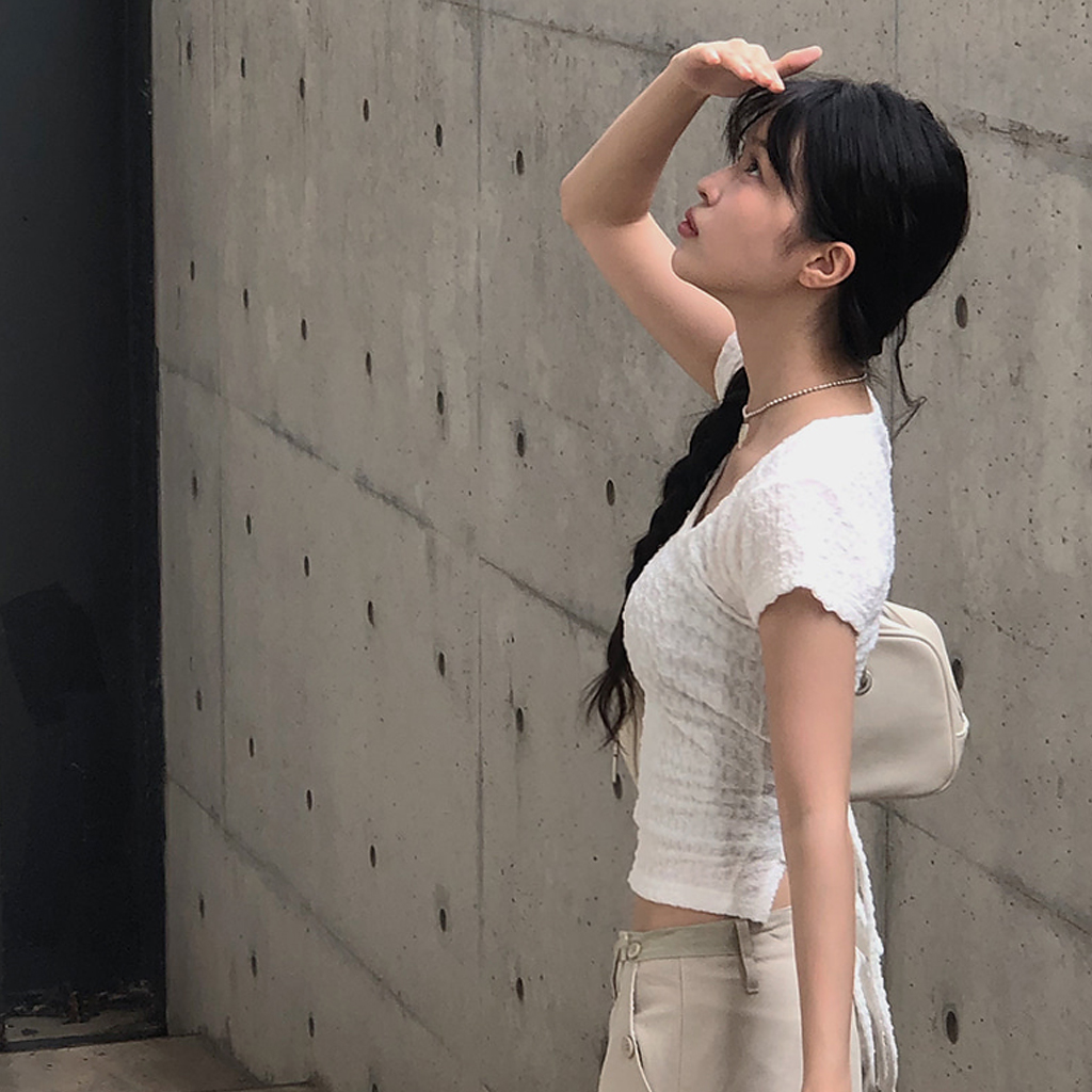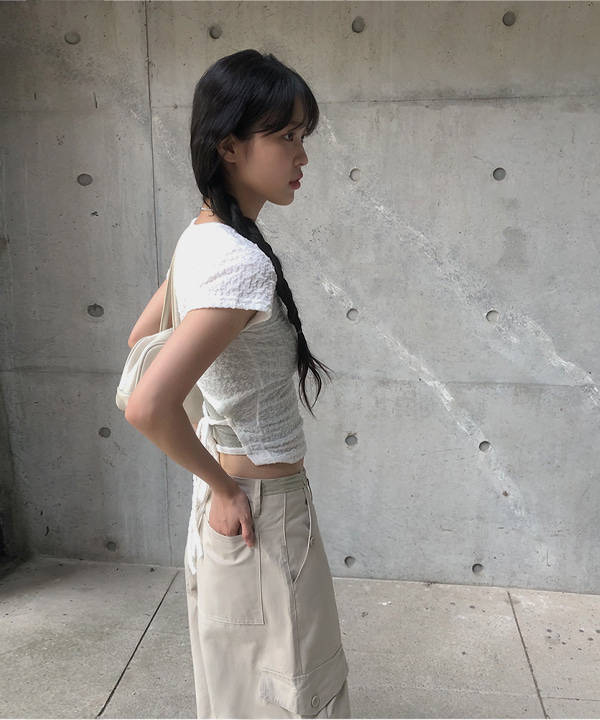 Uネック背中開きリボン半袖Tシャツ (2color)