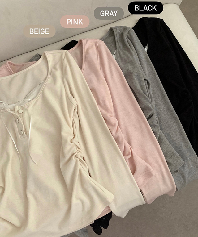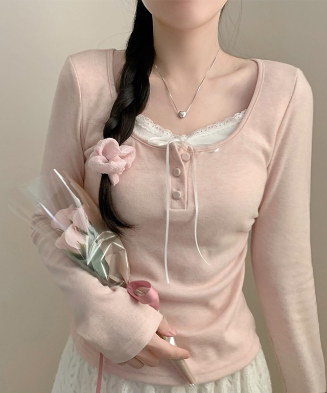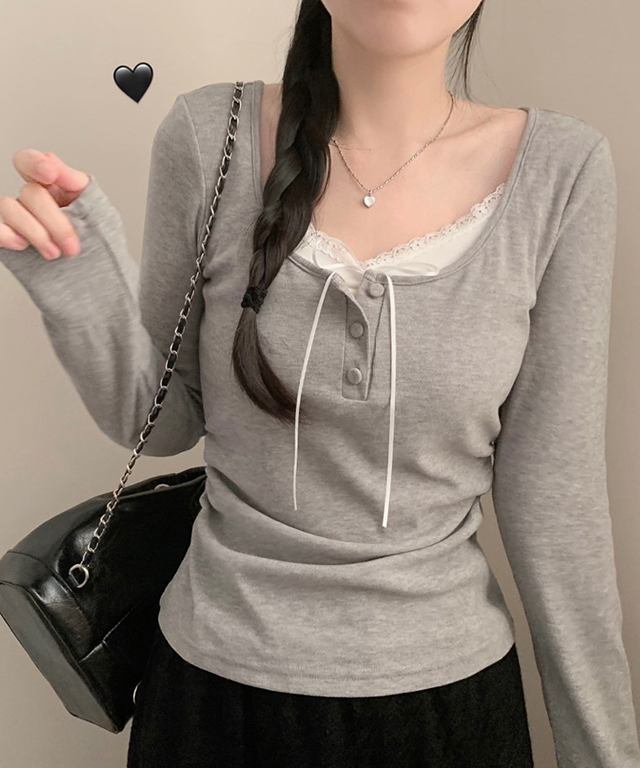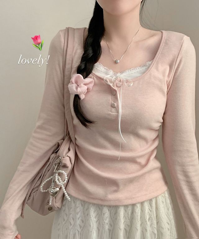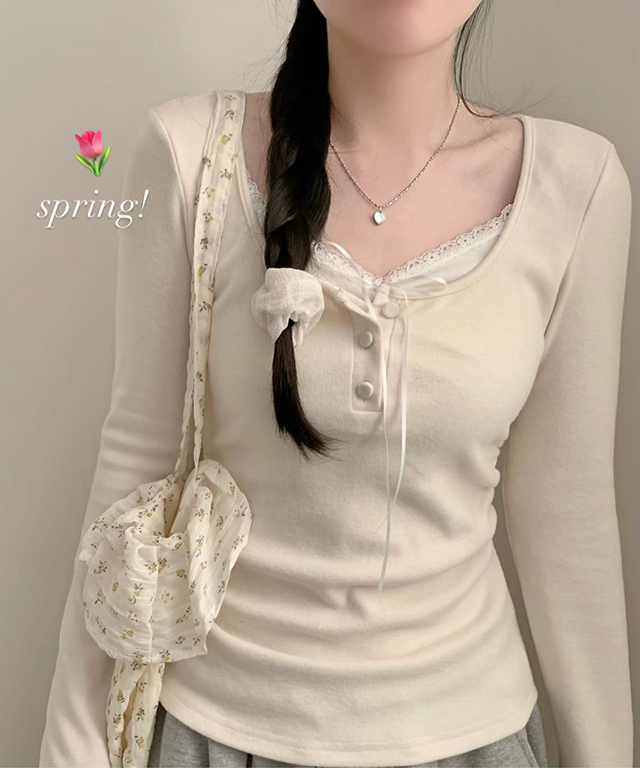 (4color) レース リボン レイヤード Tシャツ トップス