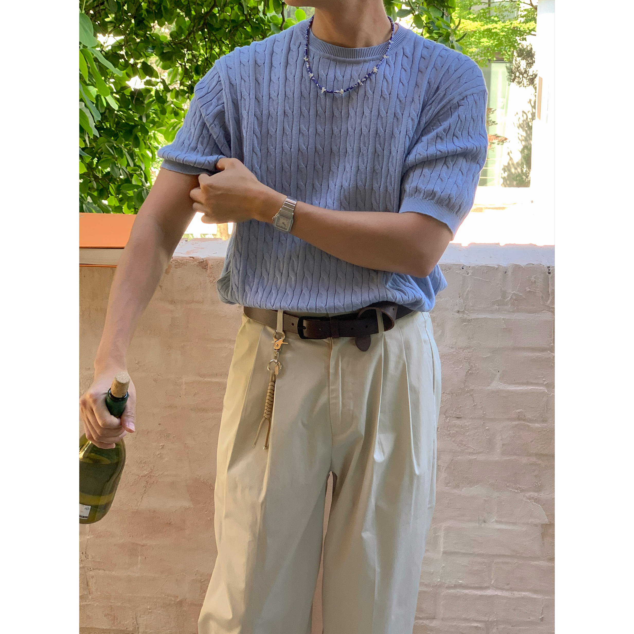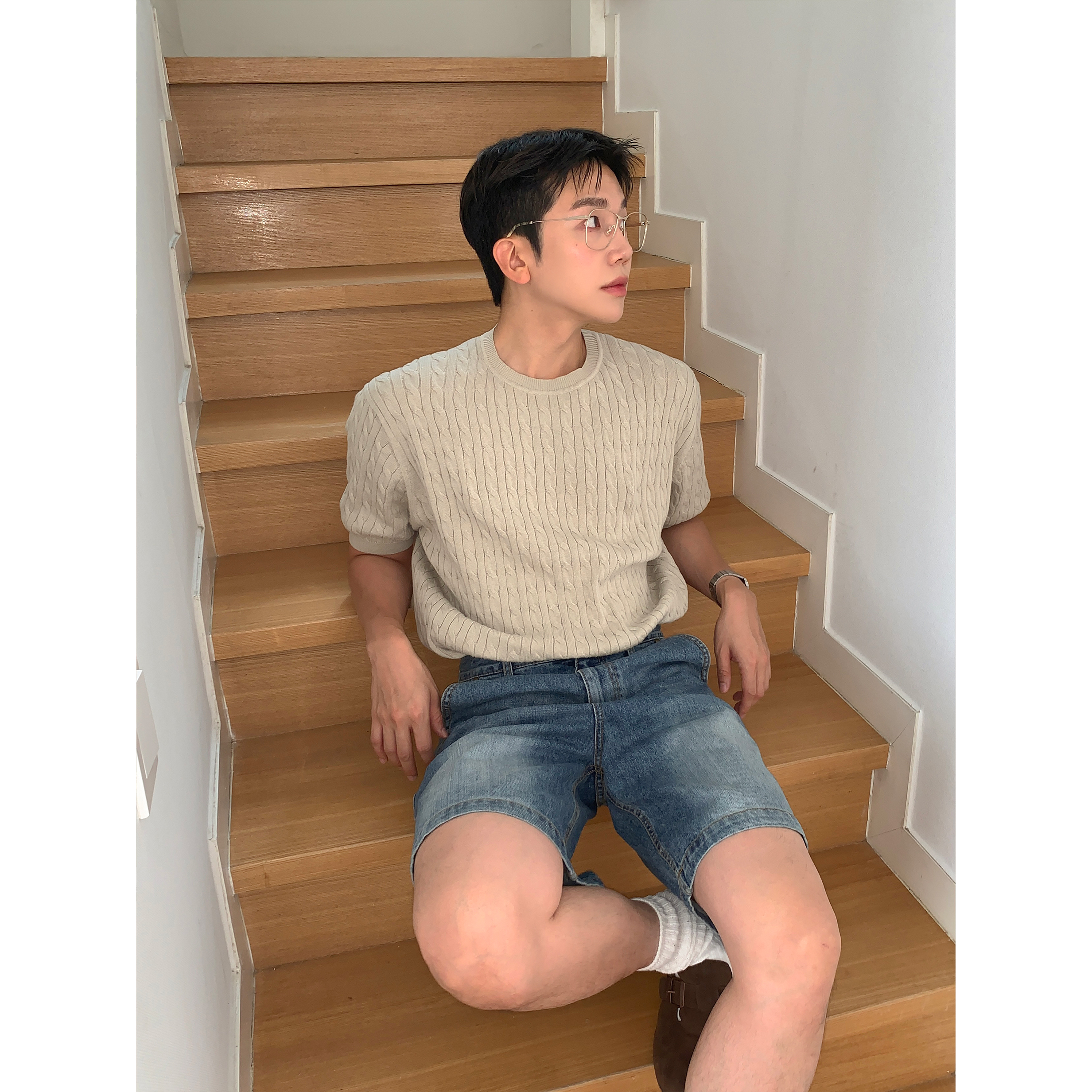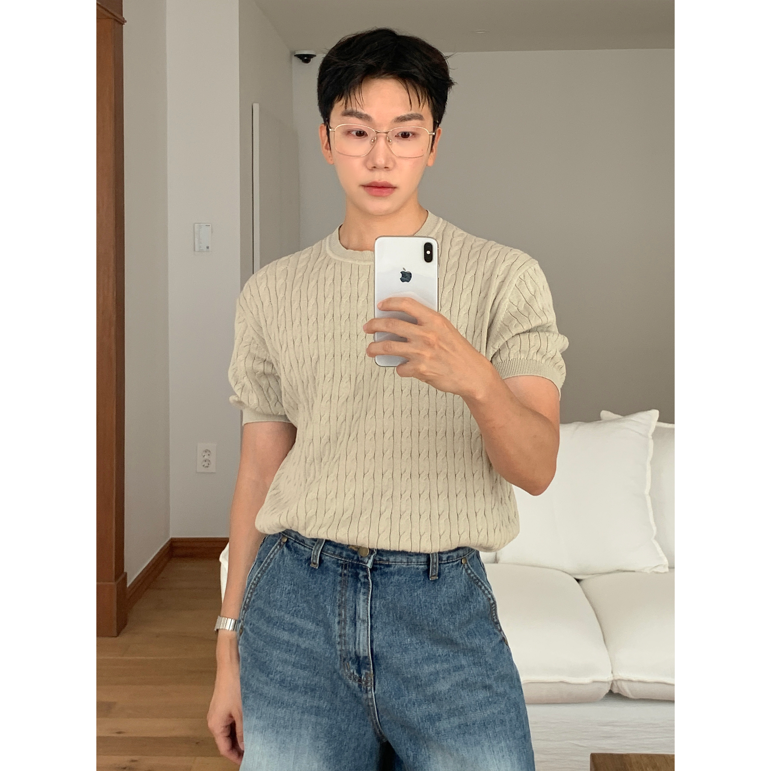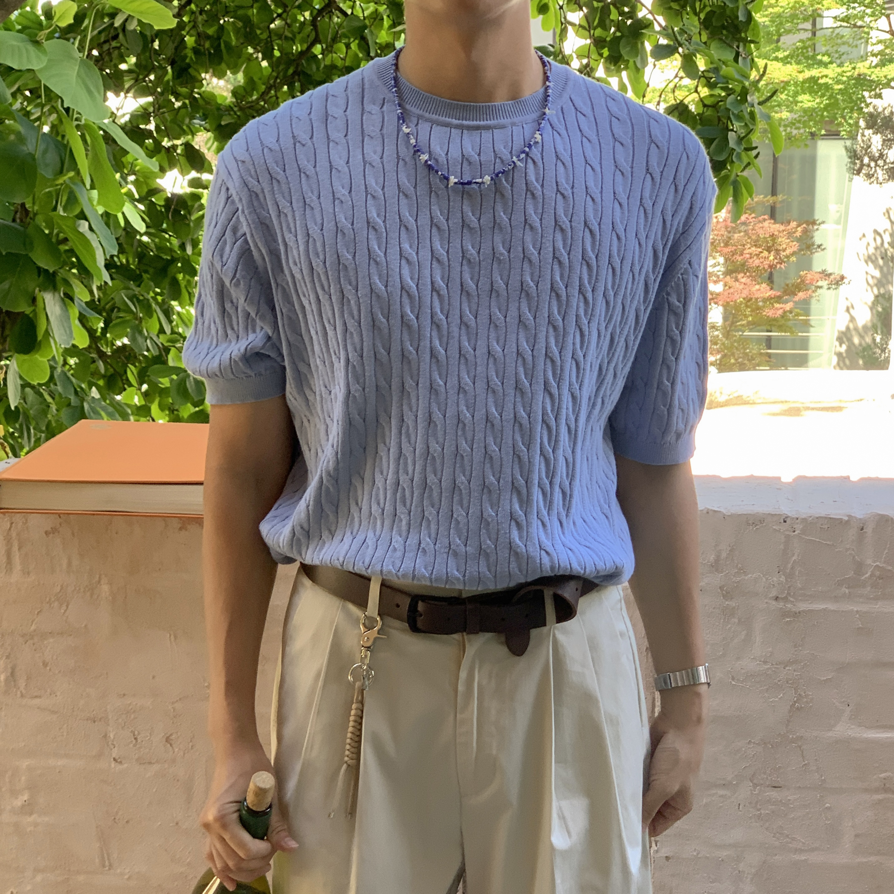 ケーブルラウンドコットン半袖ニット