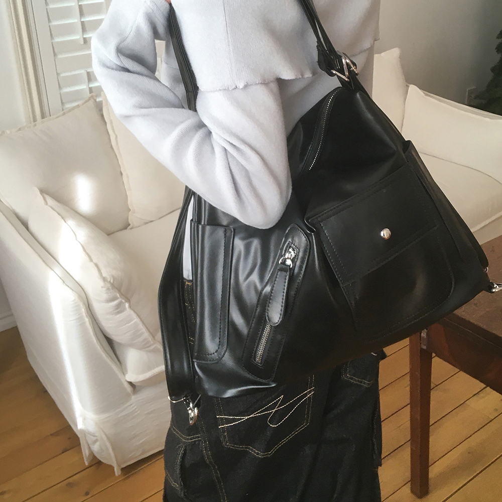 斜めストライプジップアップポケットレザーショルダーバッグ