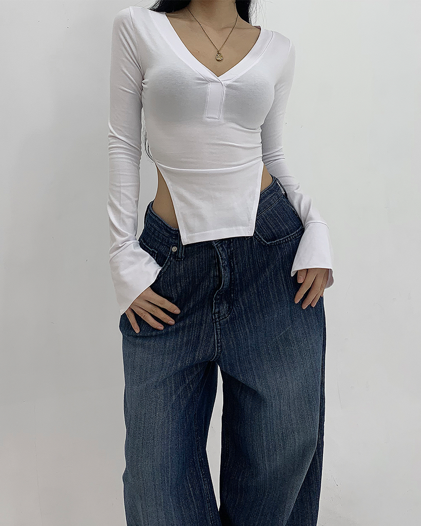 Vネックボディスーツスリットスリム長袖Tシャツ