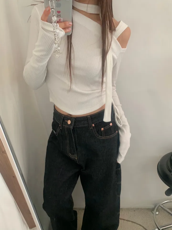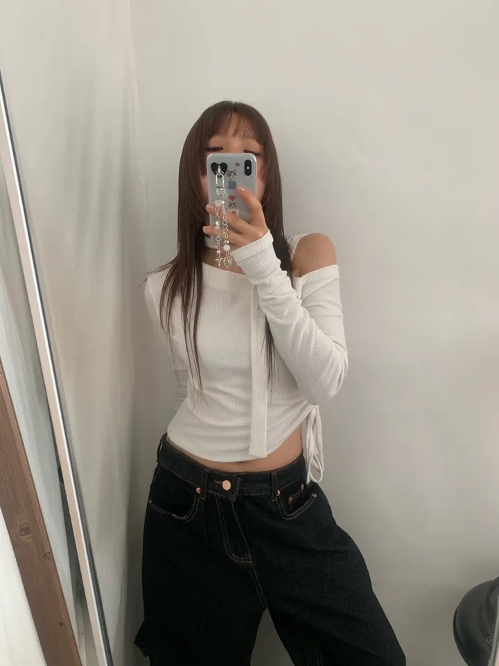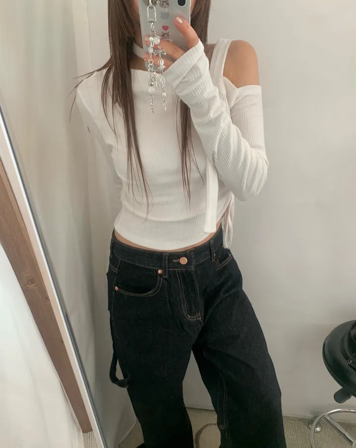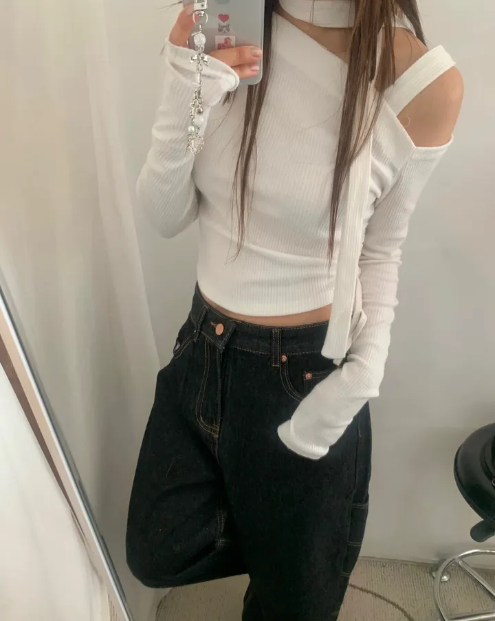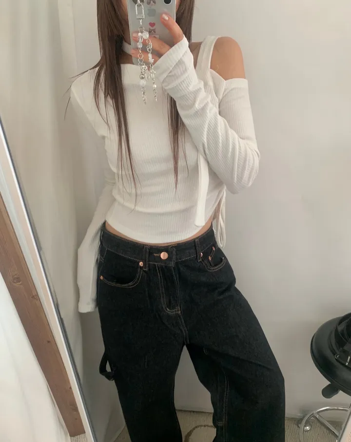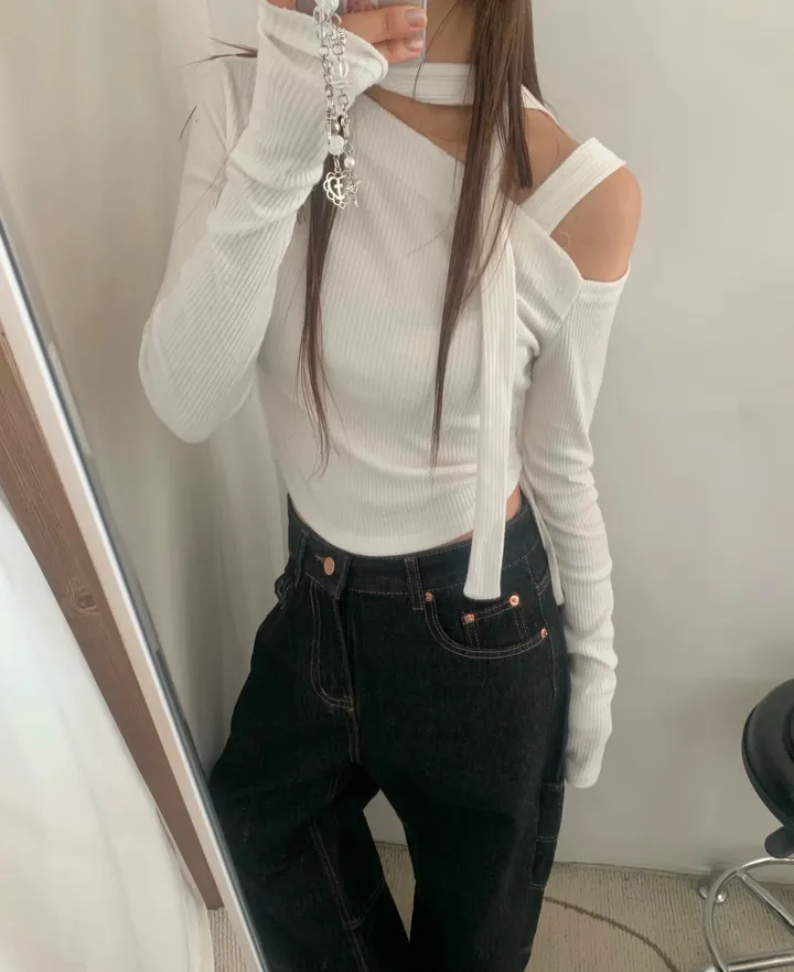 [スカーフセット]ワンショルダーオフリブTシャツ
