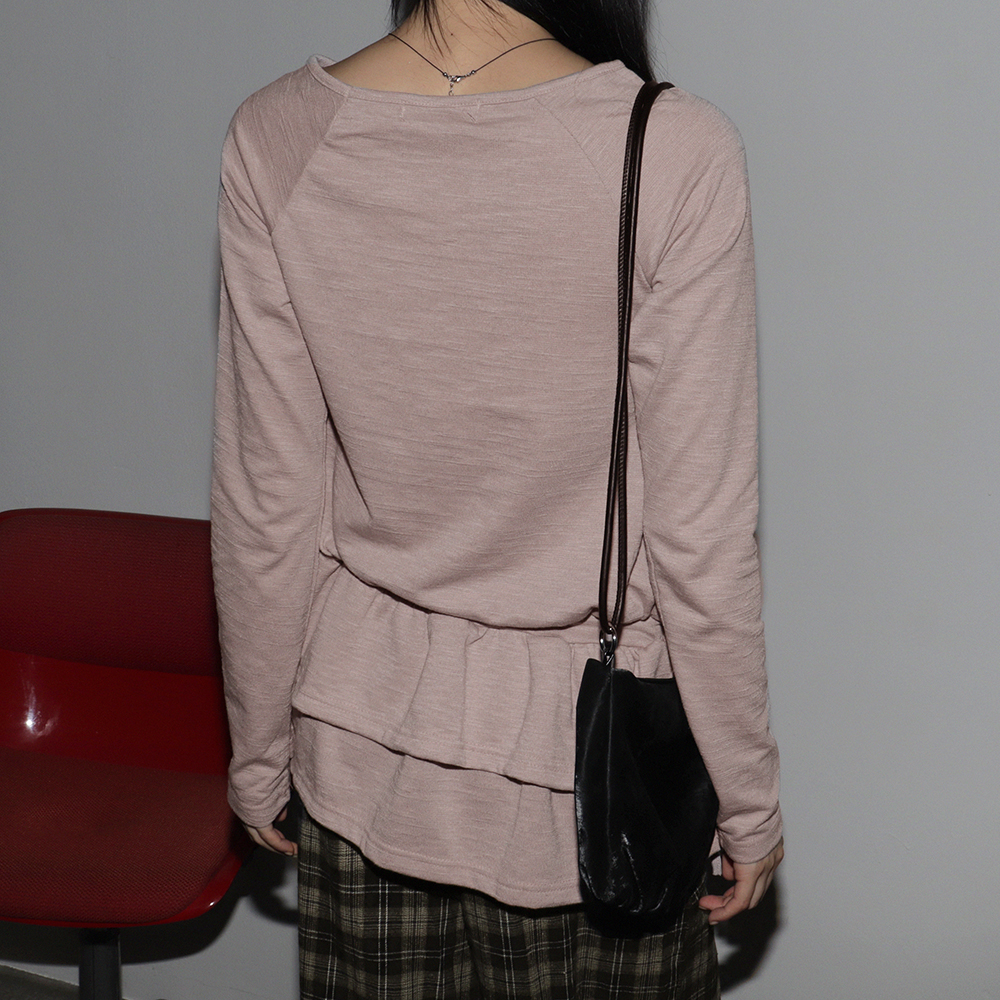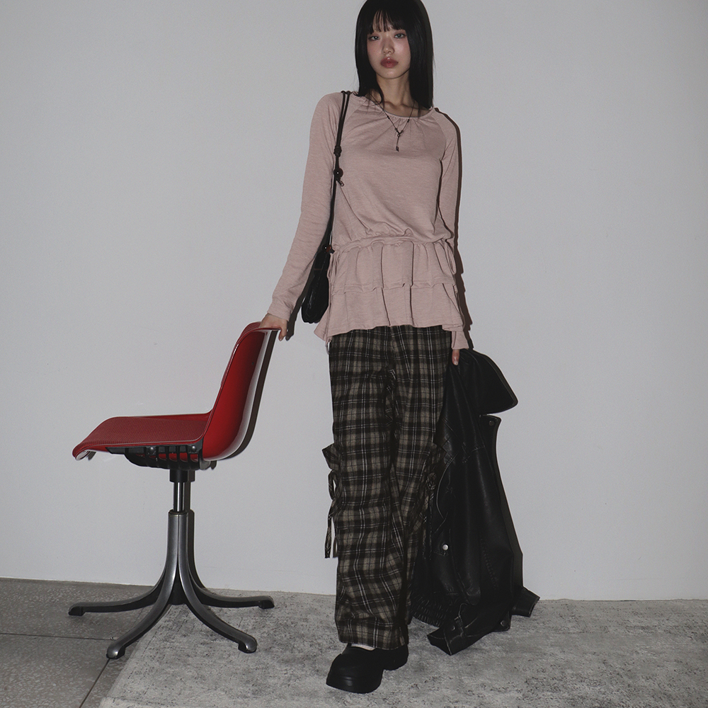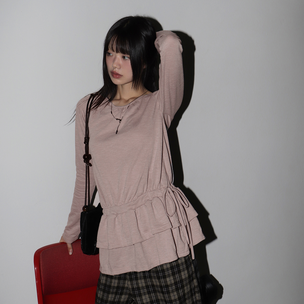 リボンフリルティアードスカートストラップラウンド長袖Tシャツ