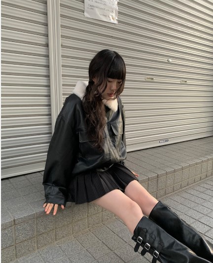 [暖かい裏地] フェイクファー襟付きレザージャケット (2color)