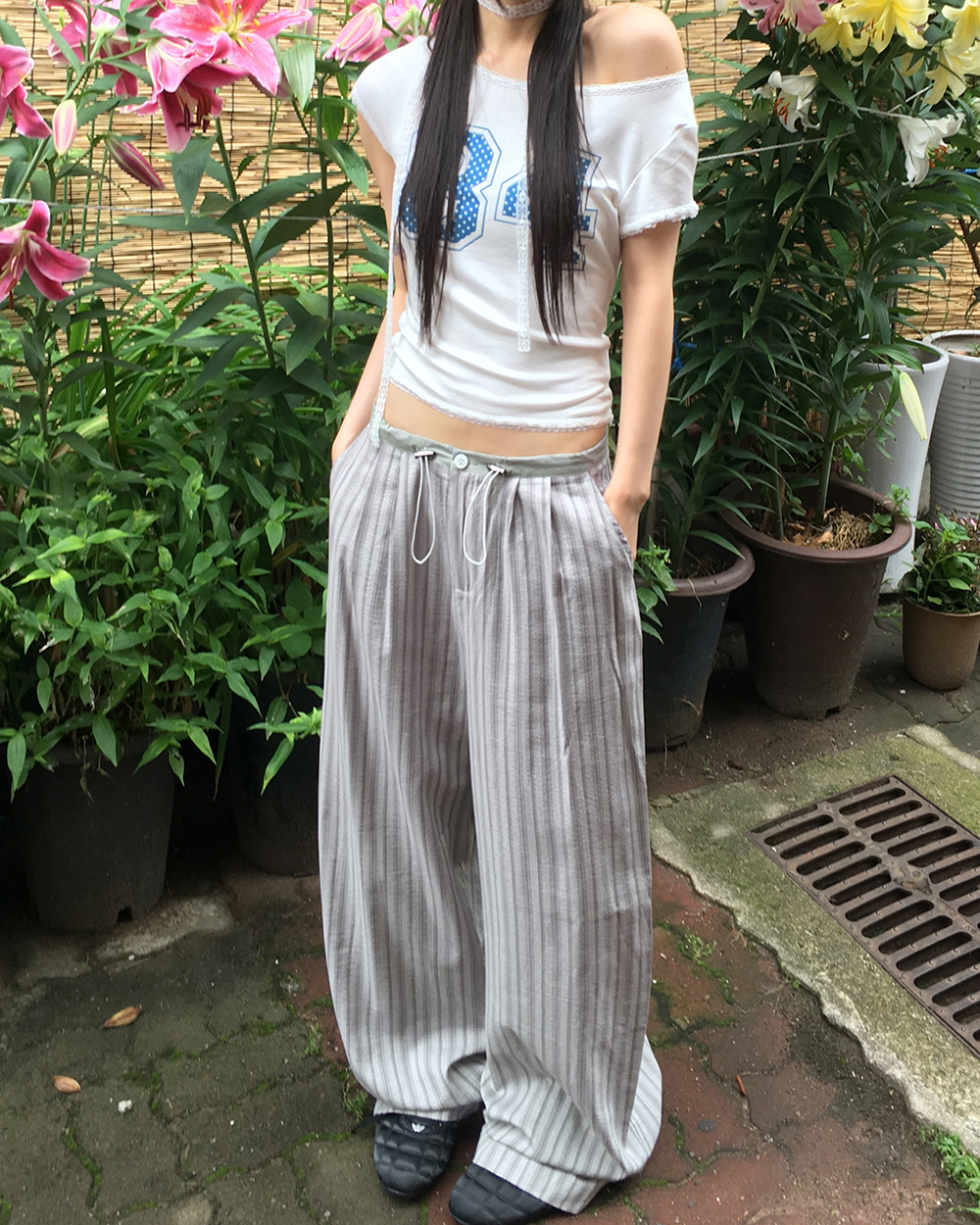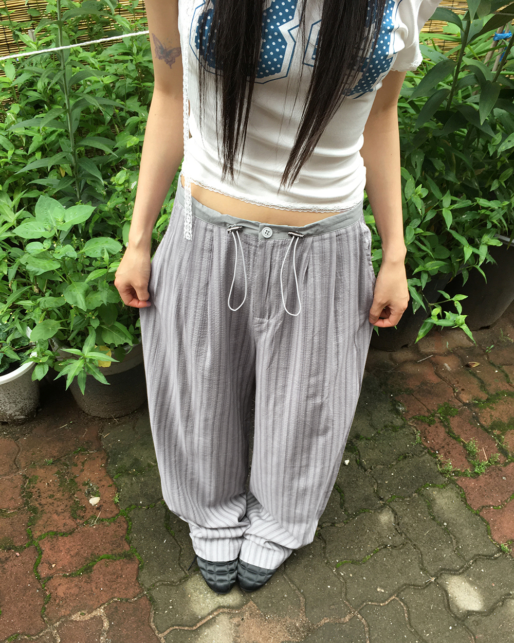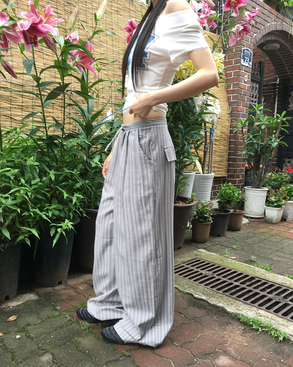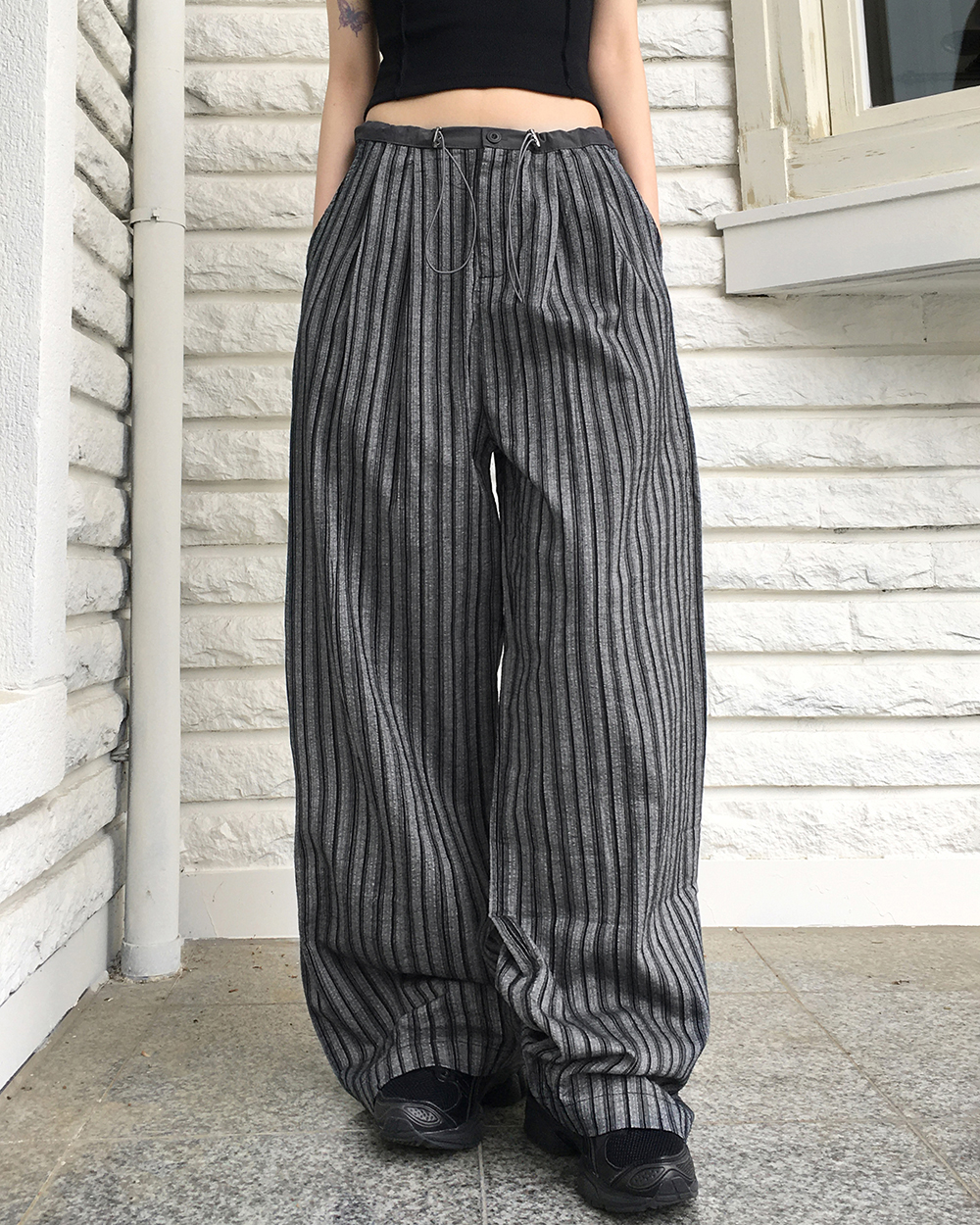 ストライプバイカラーストリングロングワイドパンツ