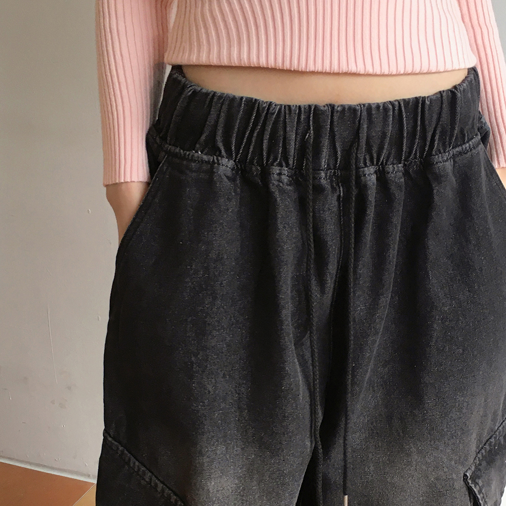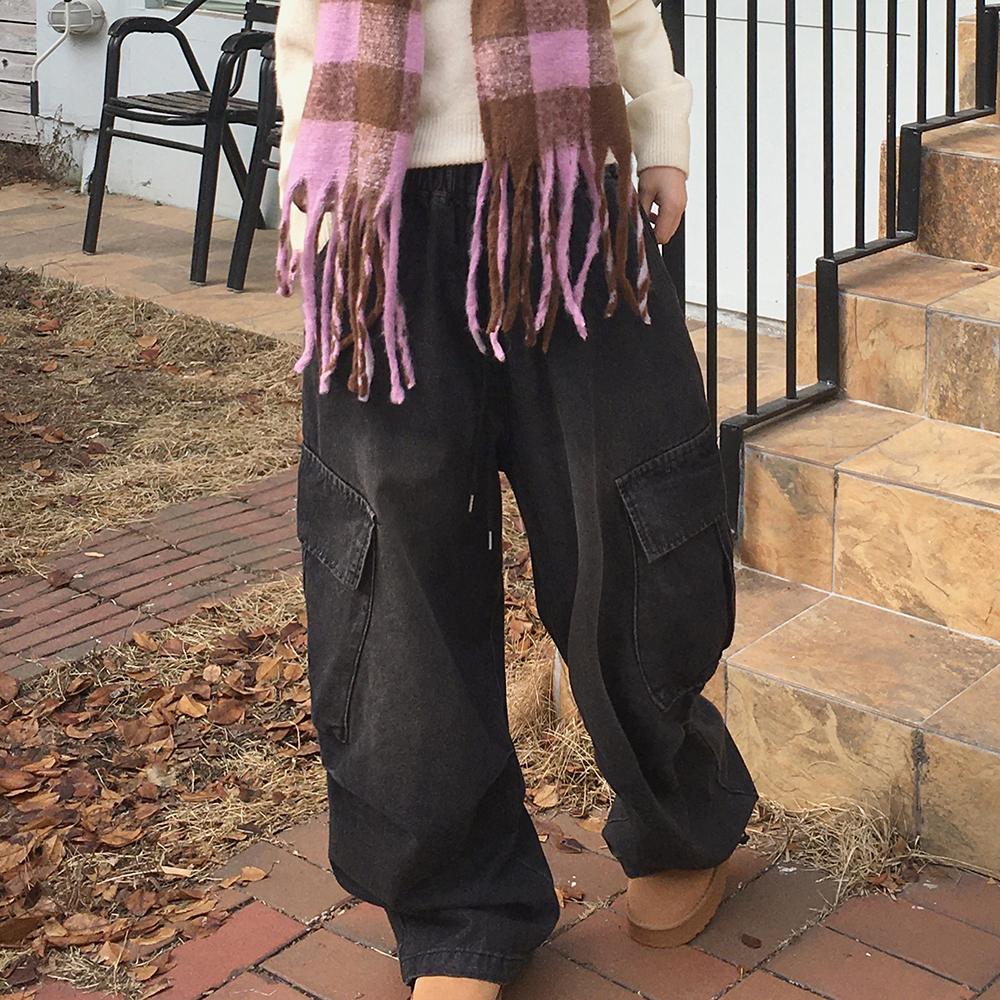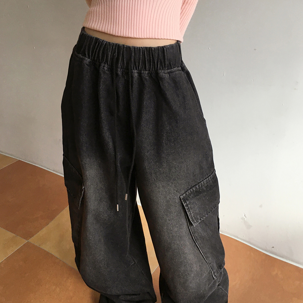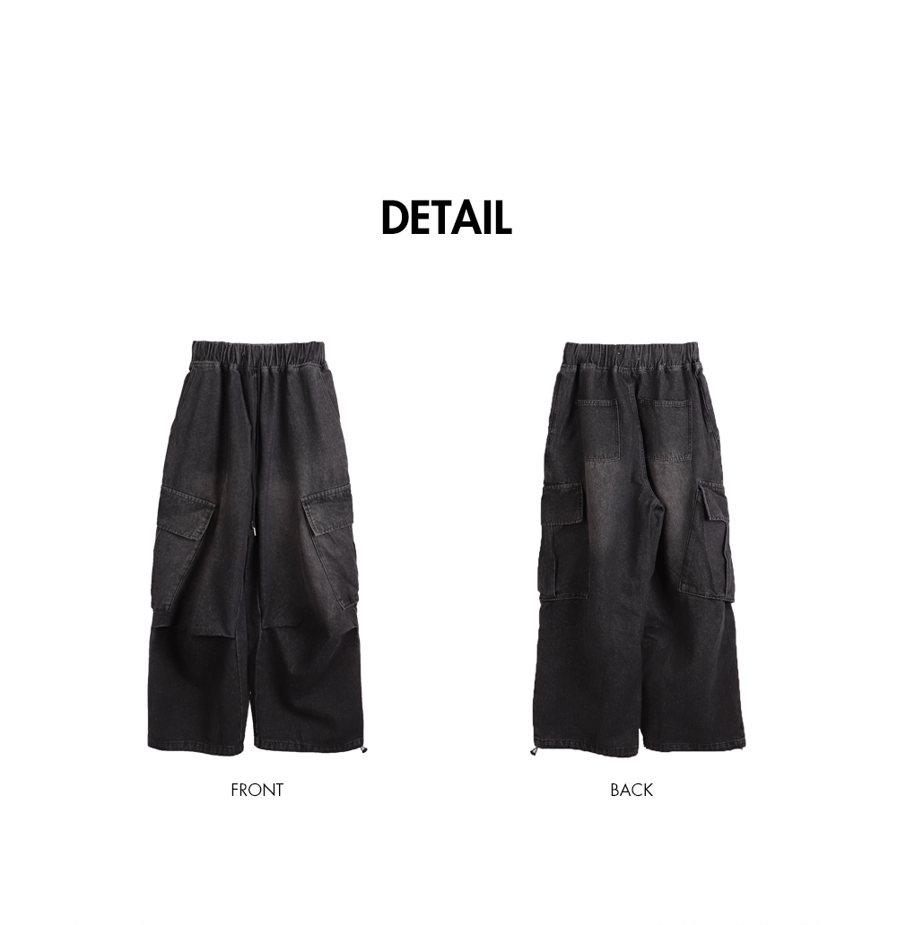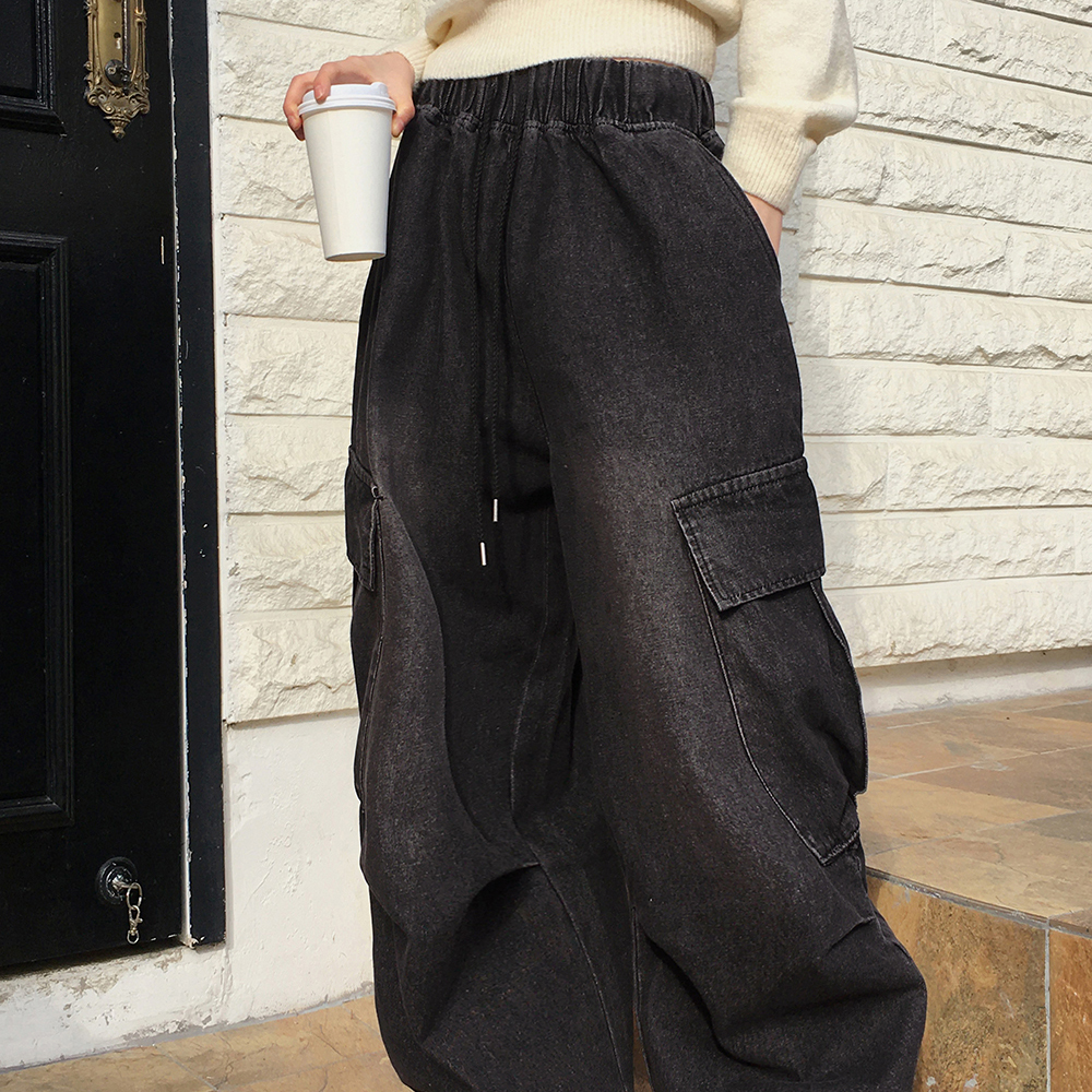 ヴィンテージウォッシュ2WAYゴムカーゴロングワイドデニムパンツ
