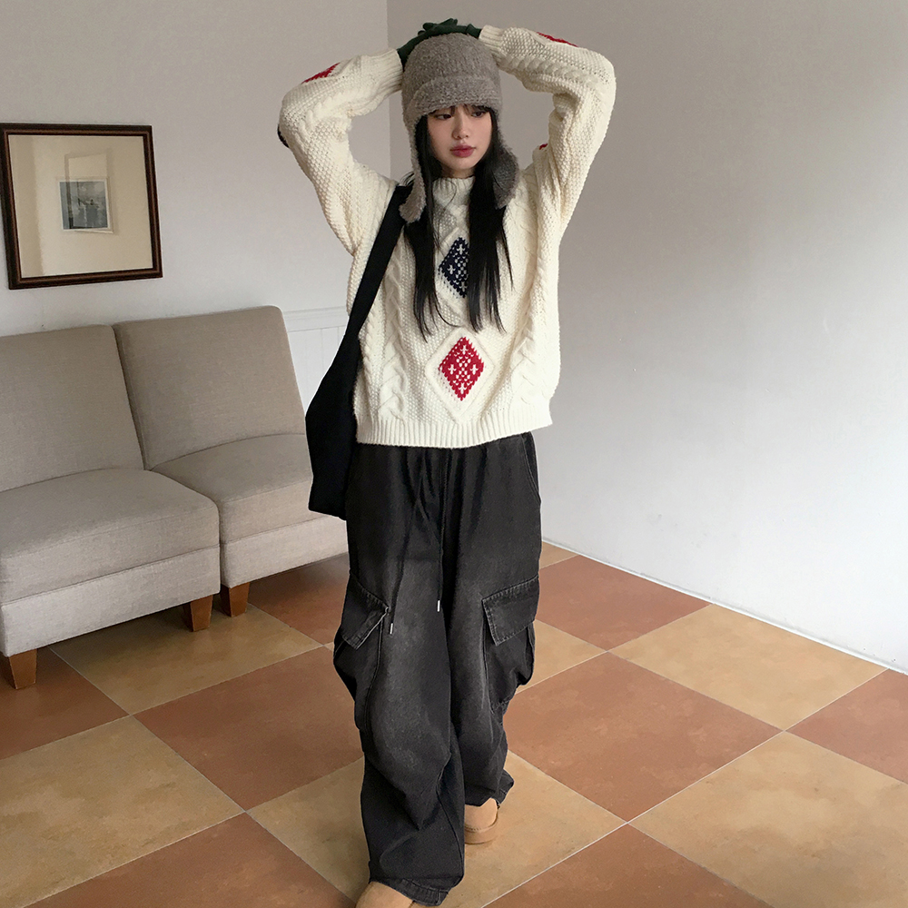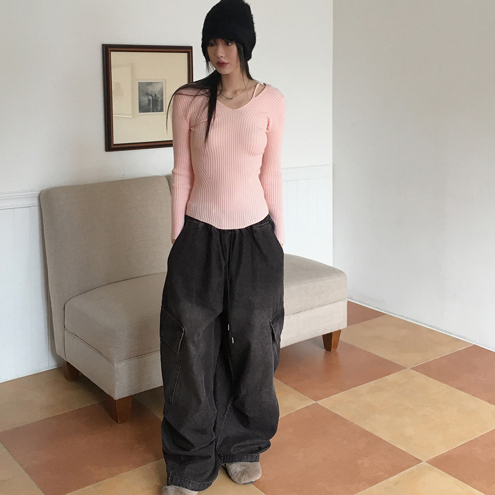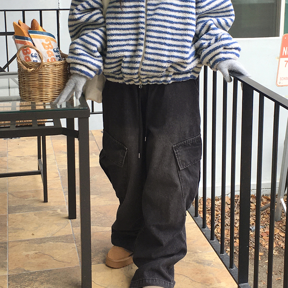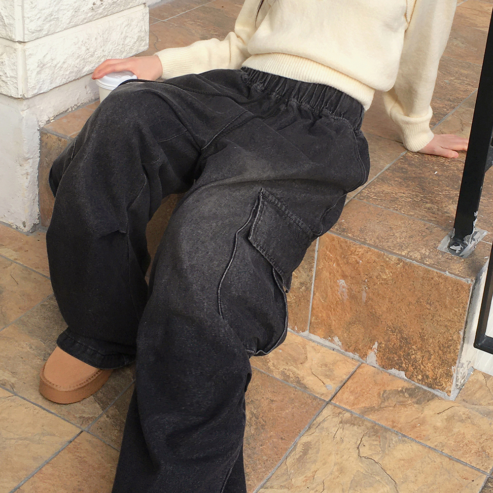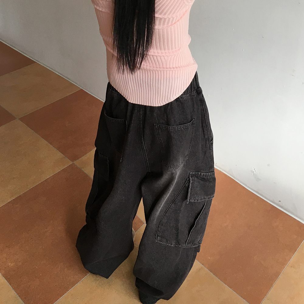 ヴィンテージウォッシュ2WAYゴムカーゴロングワイドデニムパンツ