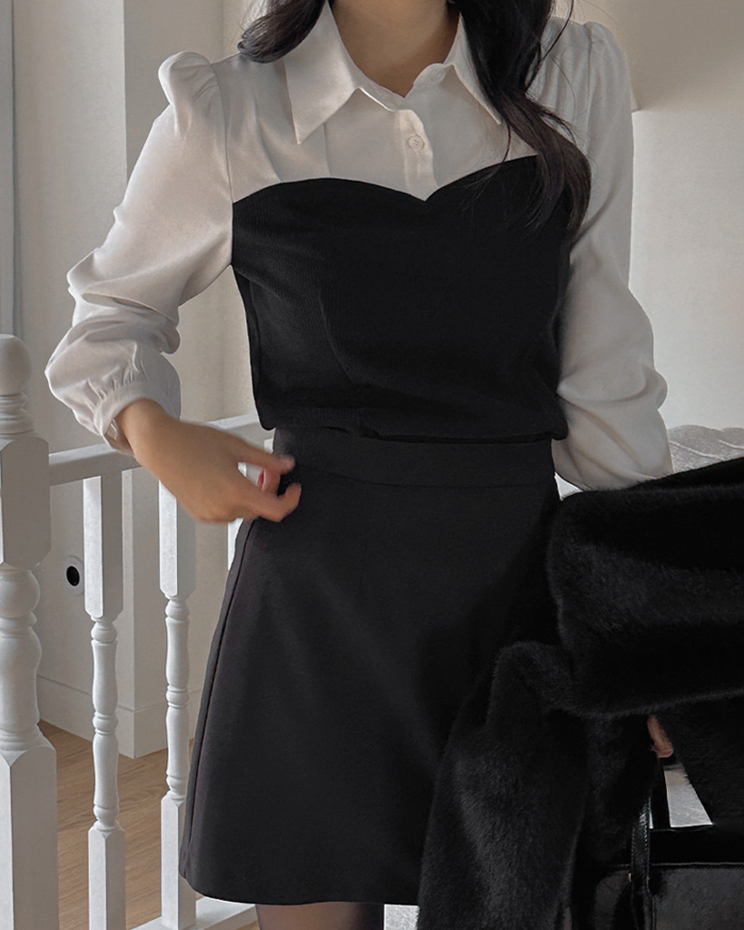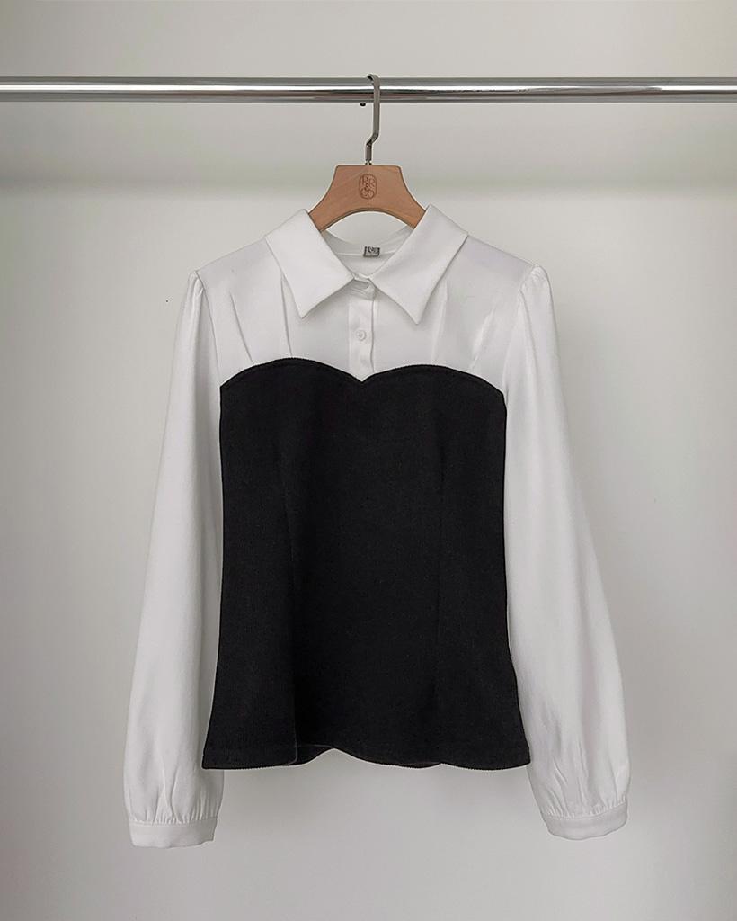 配色ハートラインピンタックカラーネックブラウス