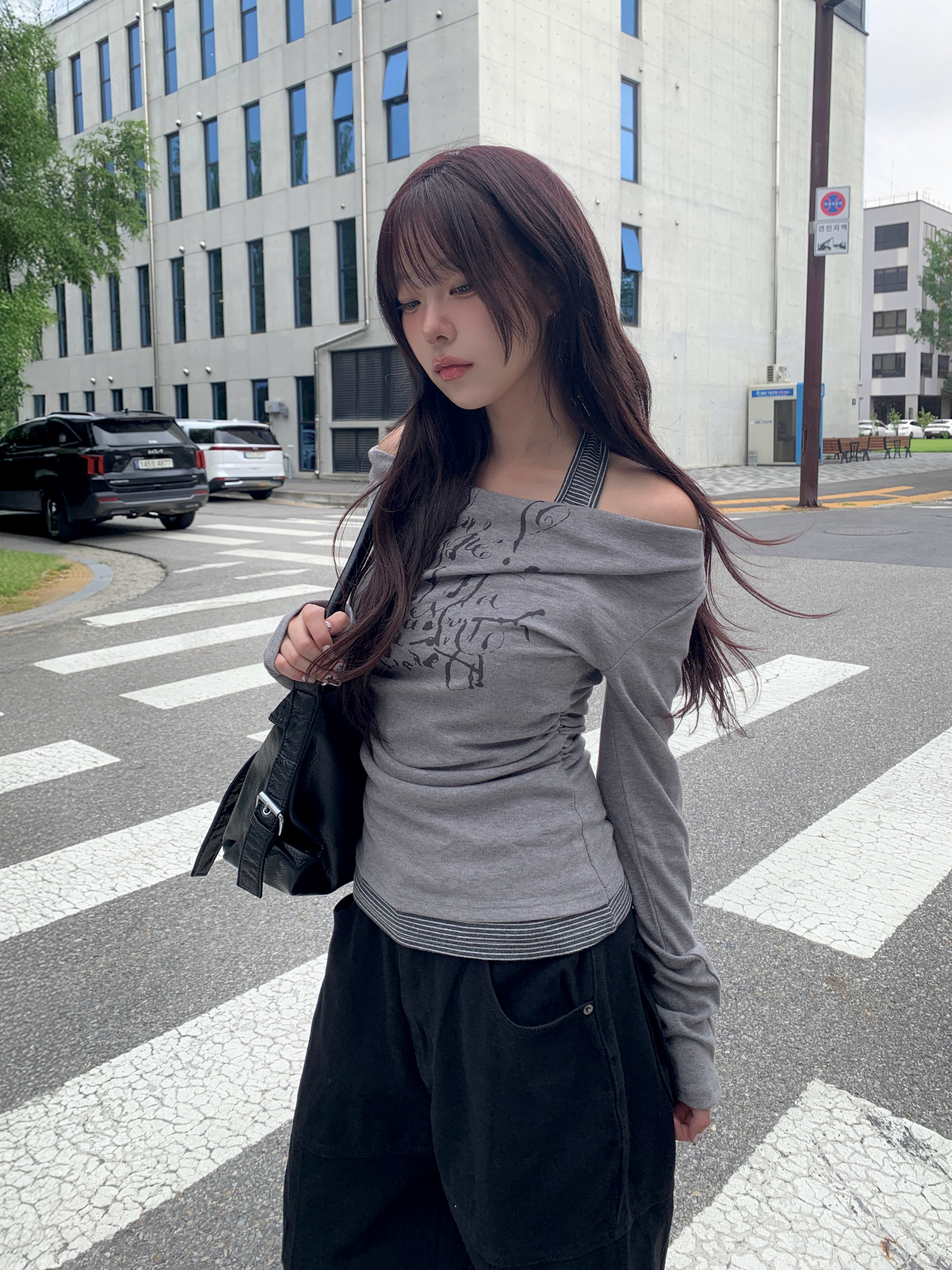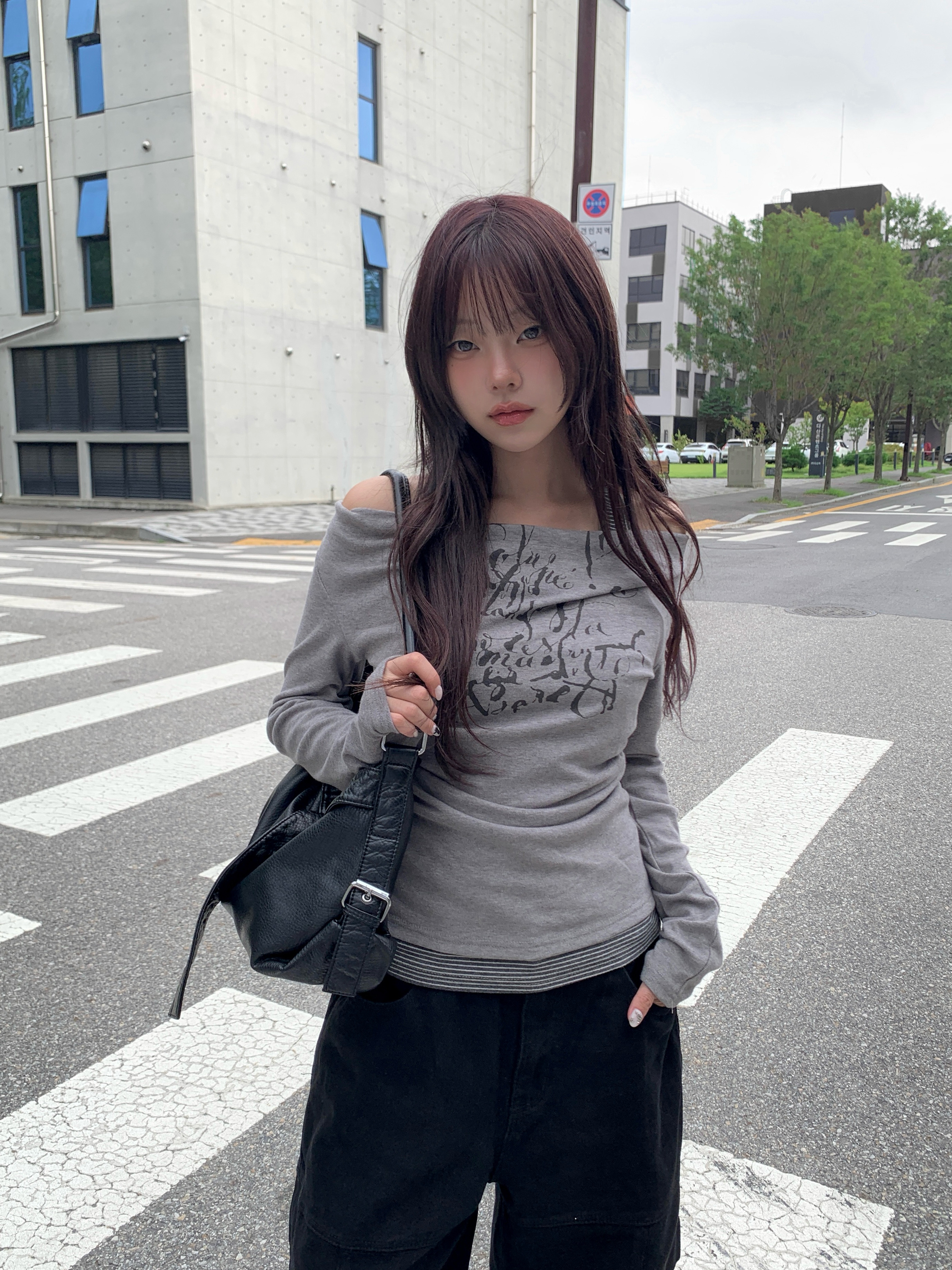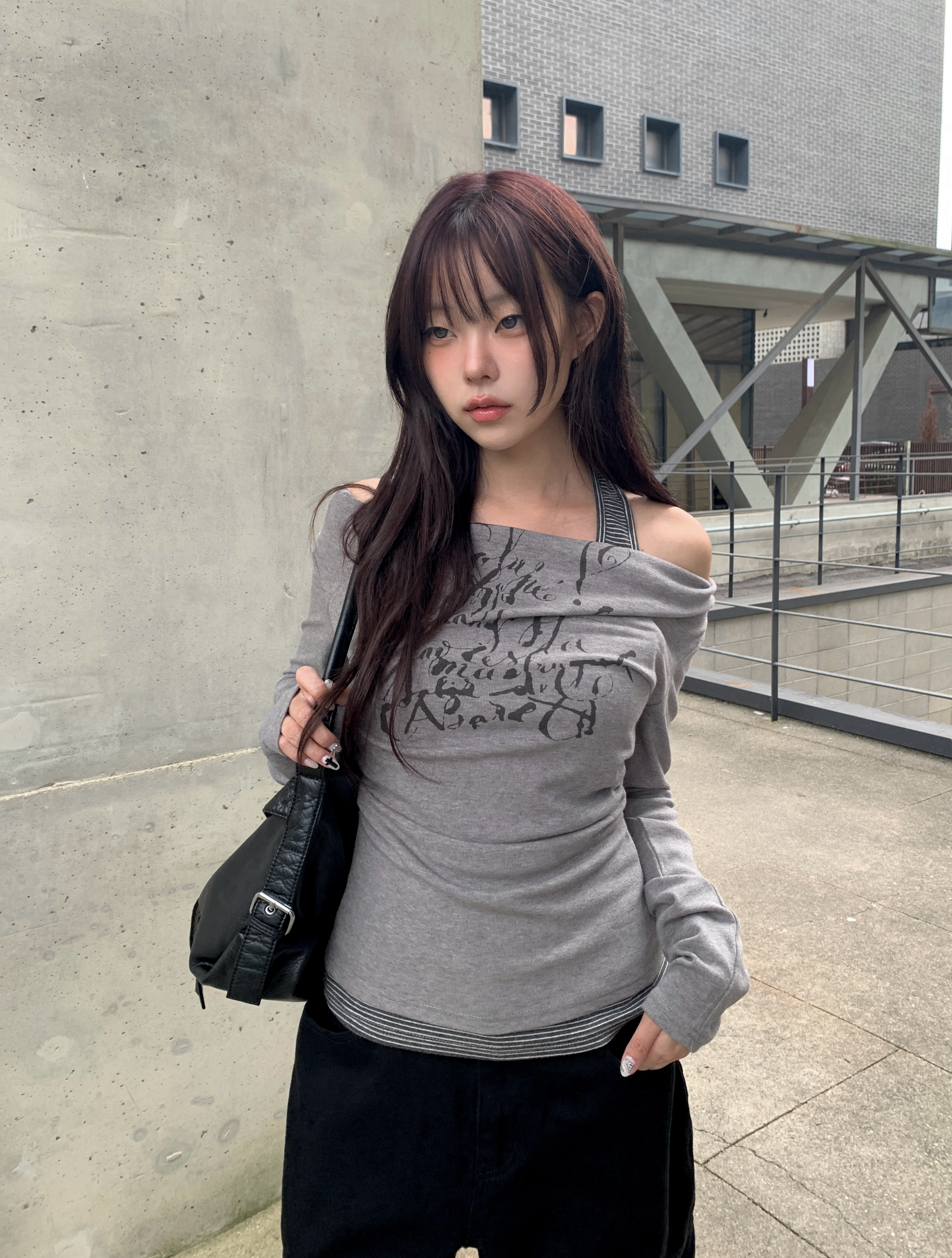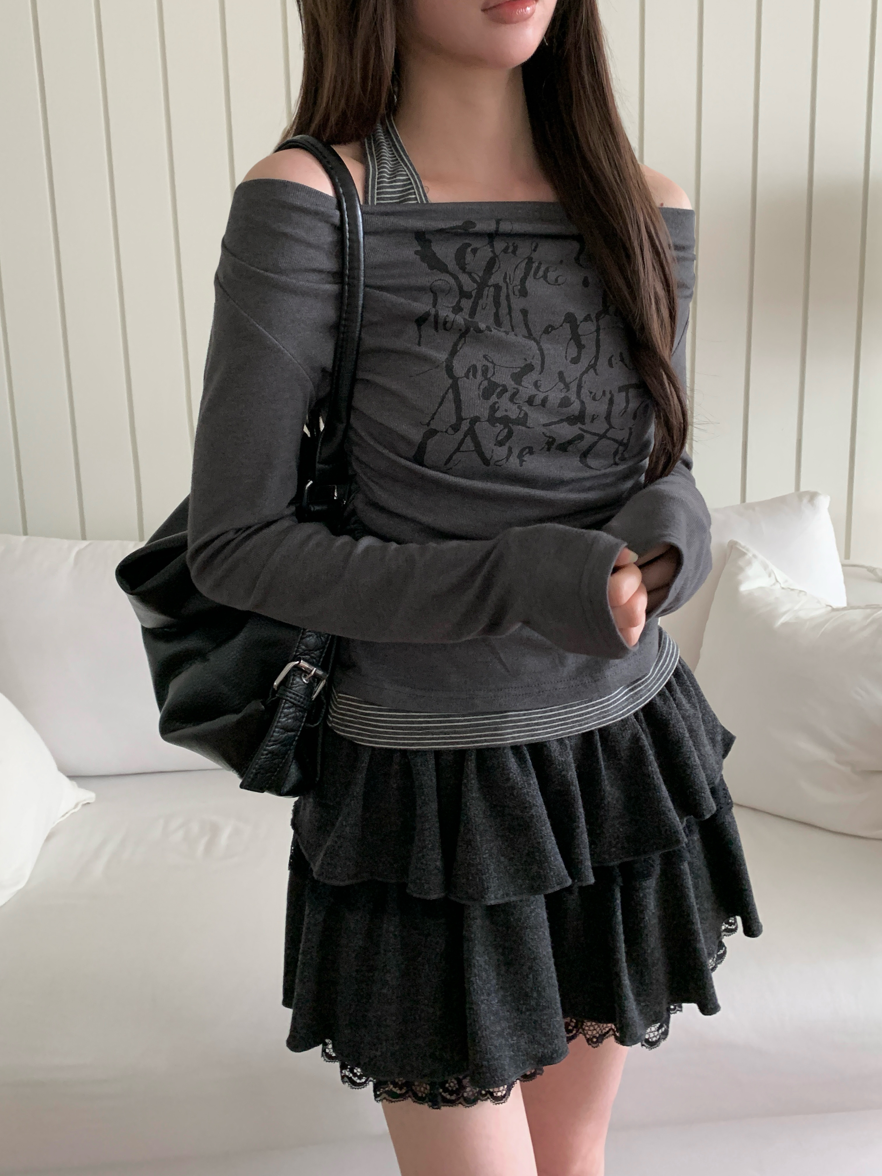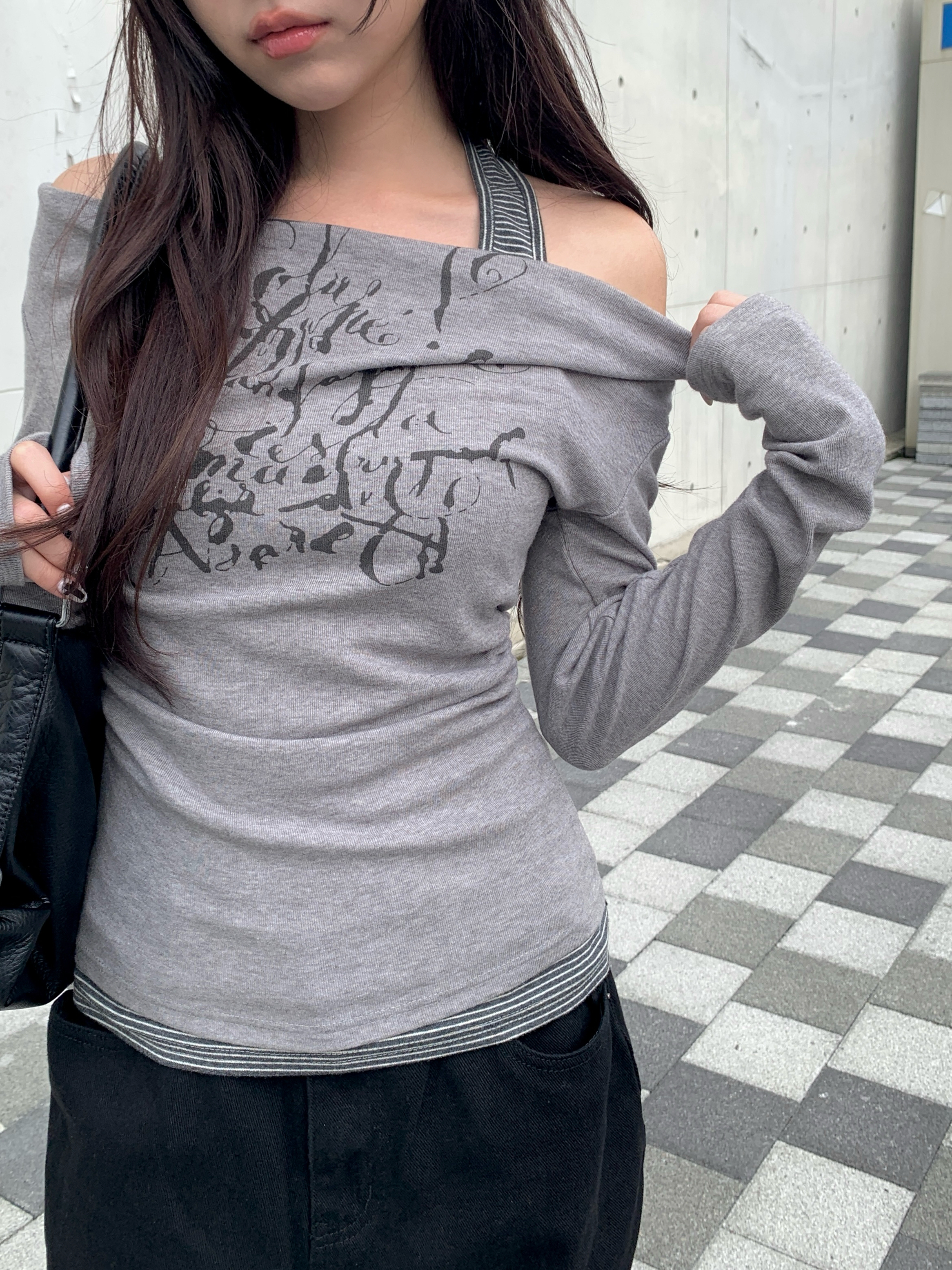 ボーダーホルターレイヤードレタリングオフショルダー長袖Tシャツ