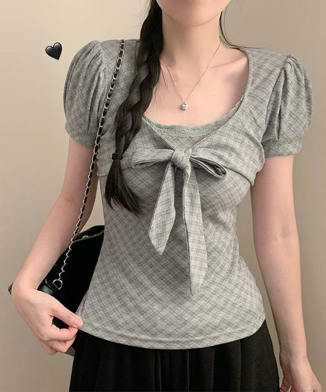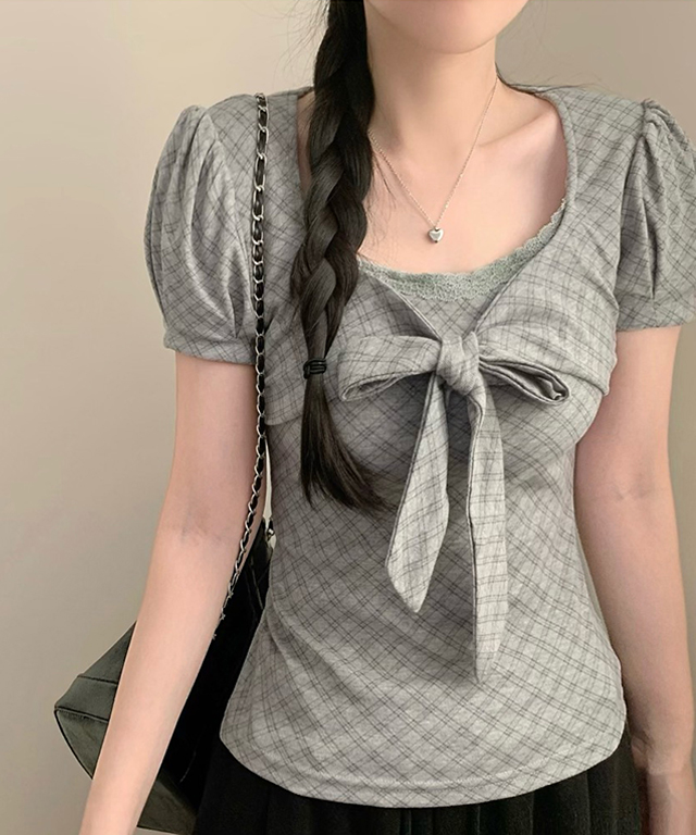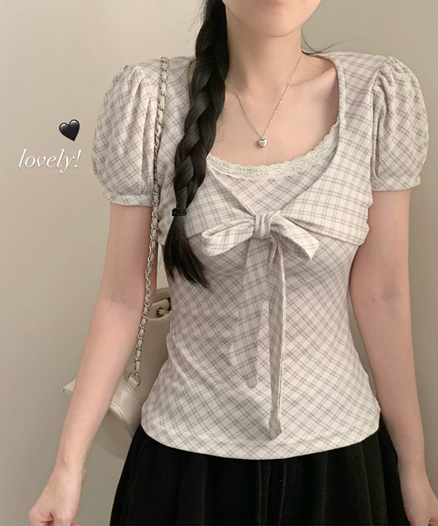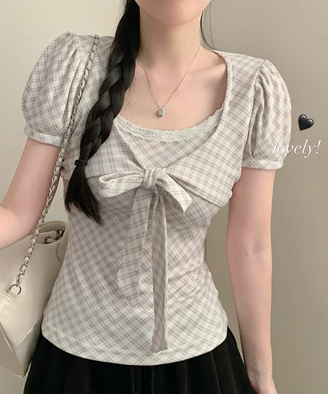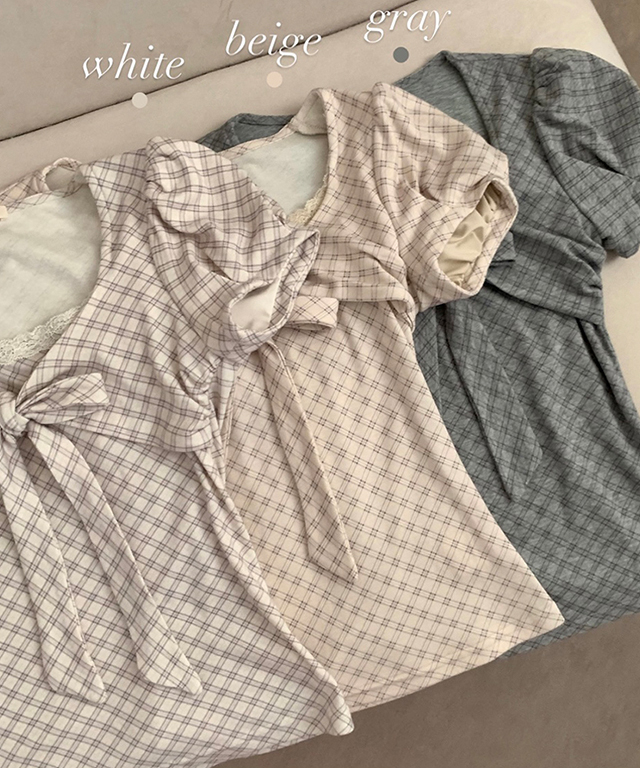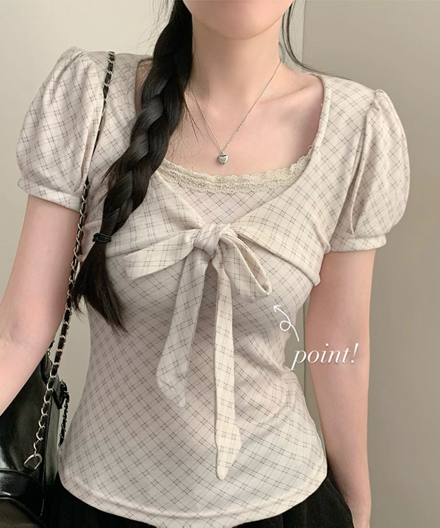 (3color)チェックリボンパフスリーブTシャツ