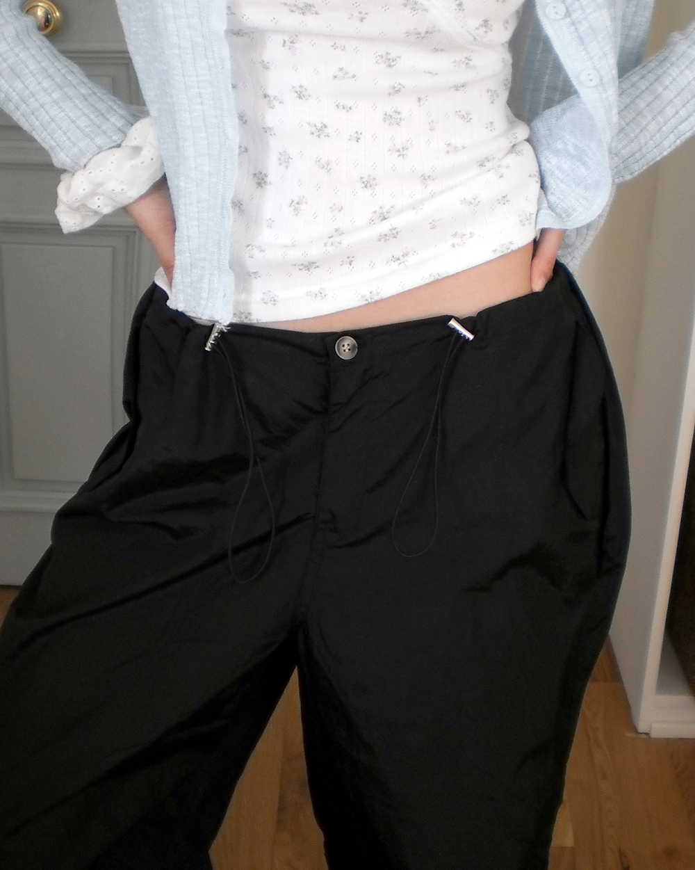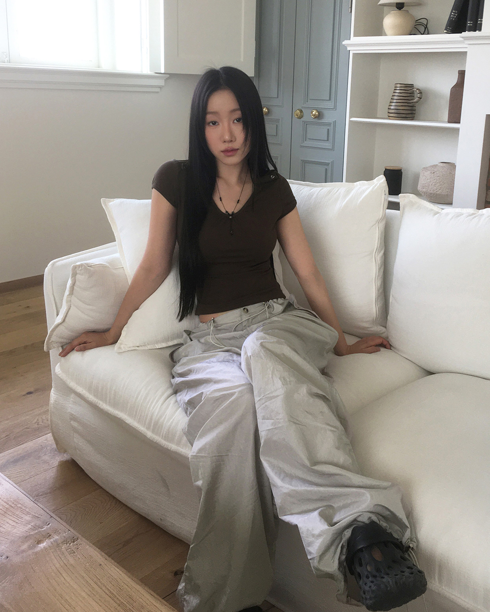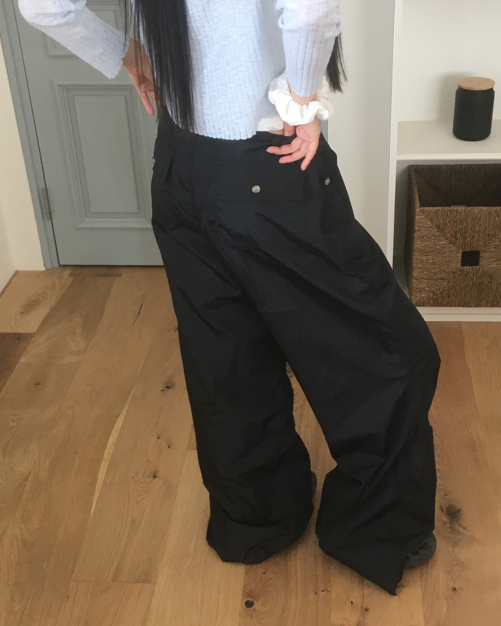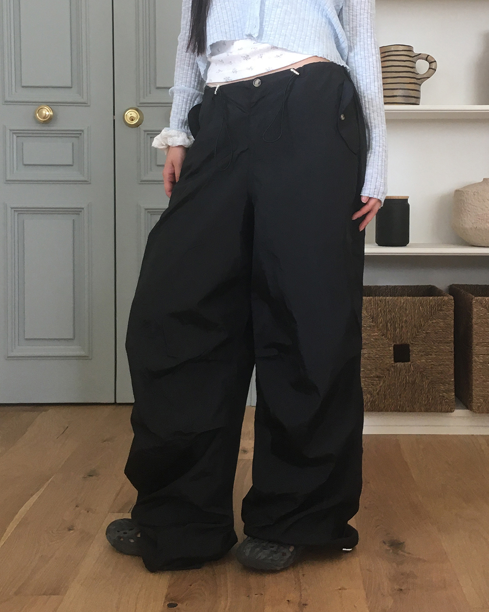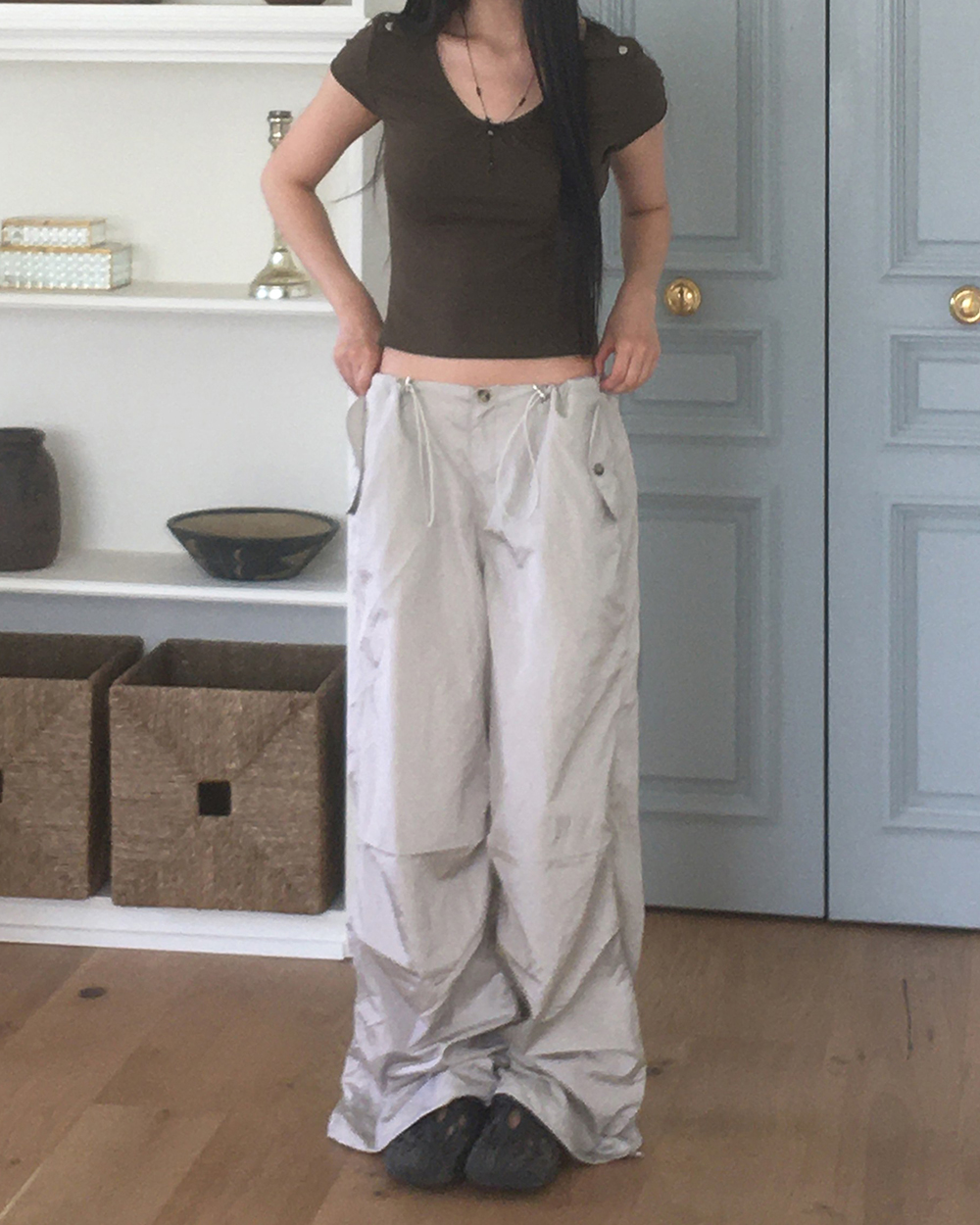 Qiya Glossy Shirring Parasuit Slit Wide Pants