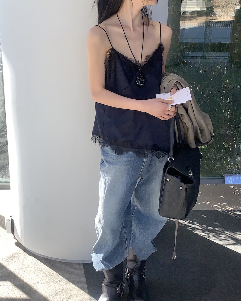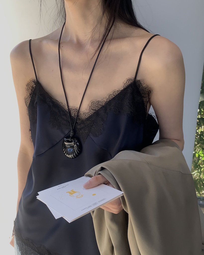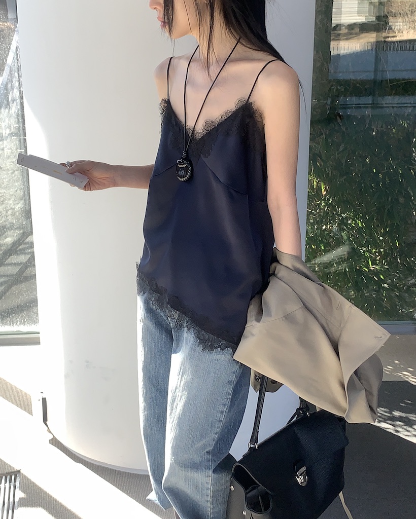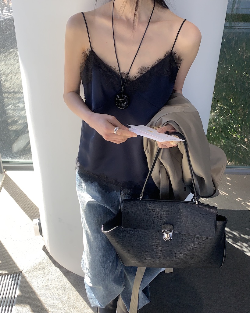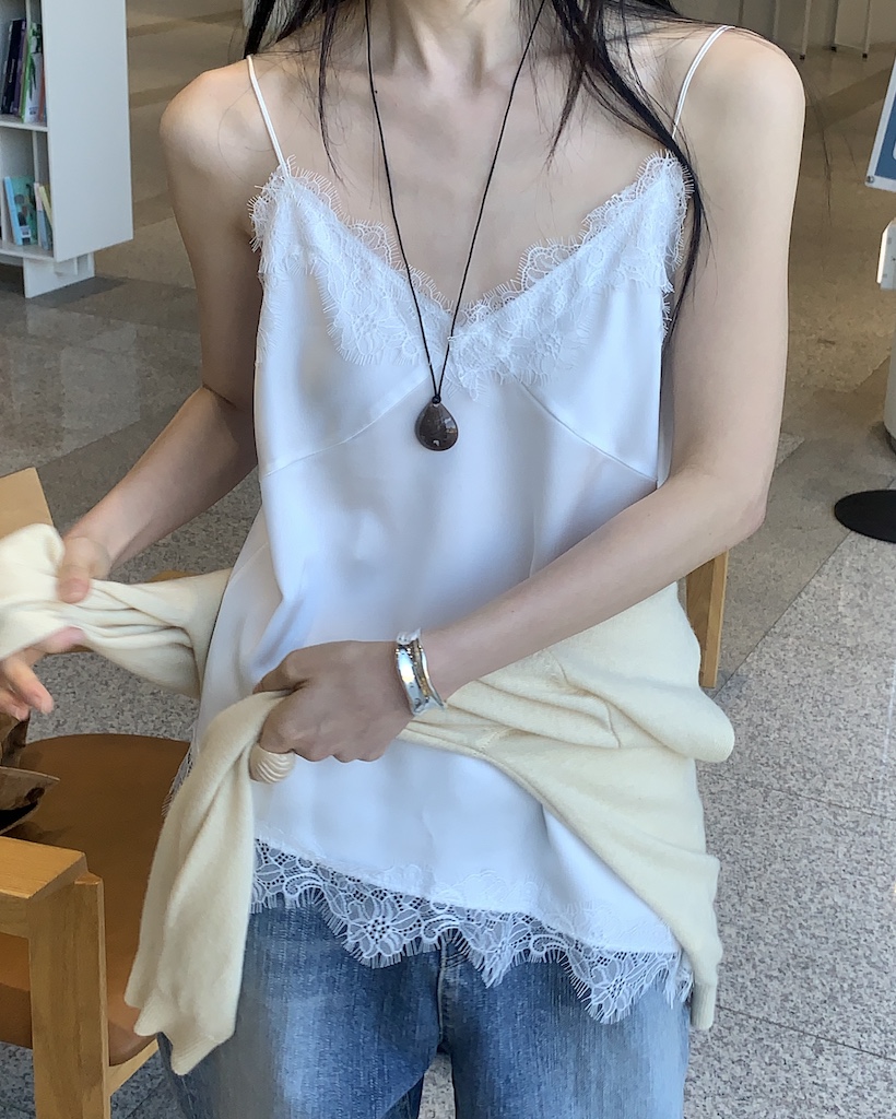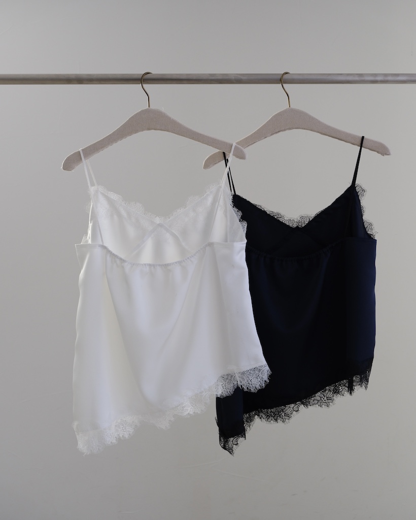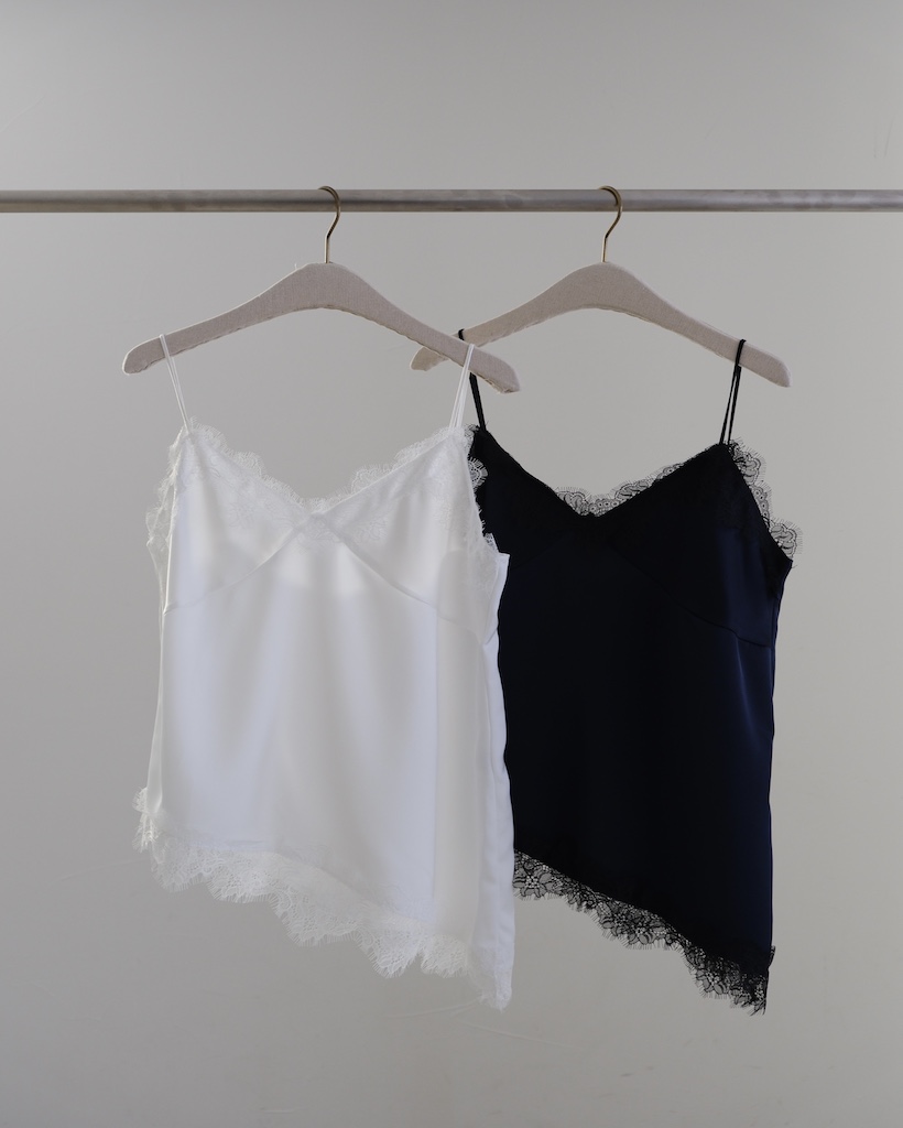 "インナー以上の価値を。裾の斜めカットとレースで仕上げた、主役級のキャミソールです。"