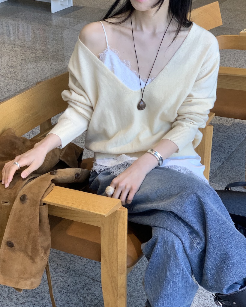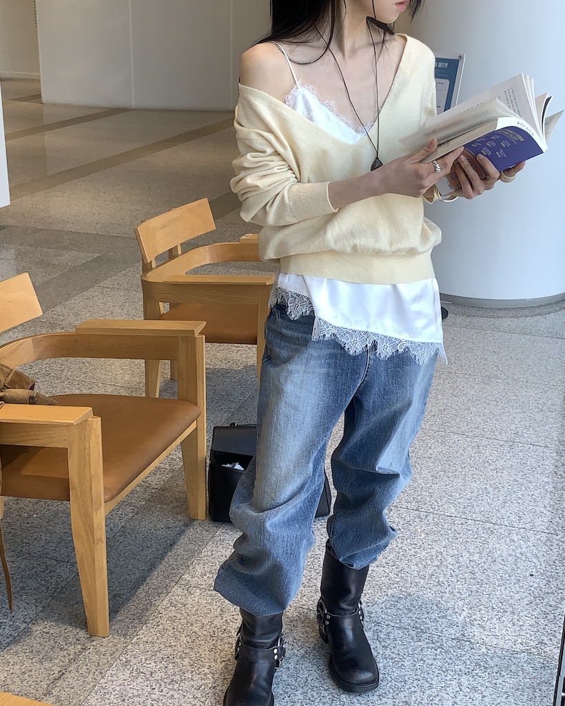 ネックラインに沿った繊細なレースディテールが、顔周りをよりソフトで華奢な印象に見せてくれます。