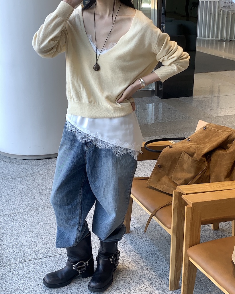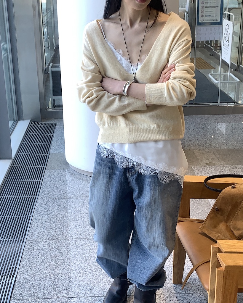 カーディガンやシャツの裾から、この斜めラインをチラリと見せるレイヤードスタイルが特におすすめです。