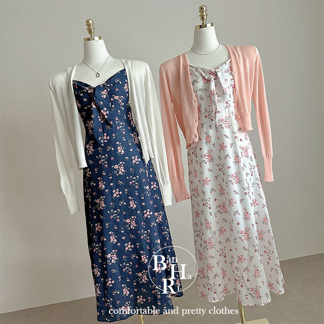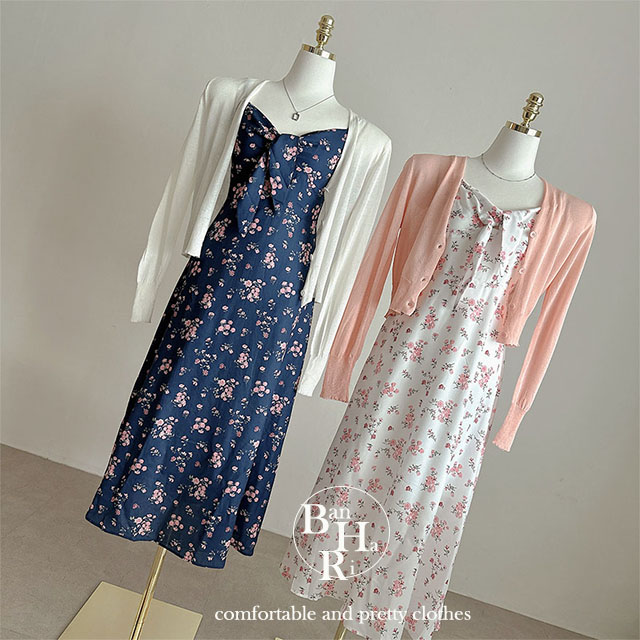 [SET] フラワーキャミソールロングワンピース+クロップド長袖カーディガンセット