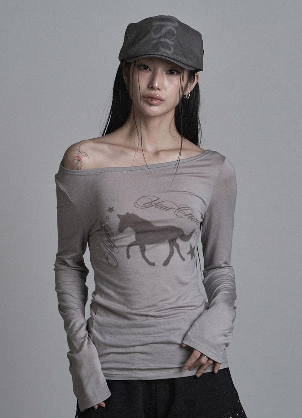 HORSE BOAT NECK LONG SLEEVE DARK GREY