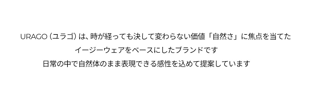 URAGO(ユラゴ)は、時が経っても決して変わらない価値「自然さ」に焦点を当てたイージーウェアをベースにしたブランドです 日常の中で自然体のまま表現できる感性を込めて提案しています