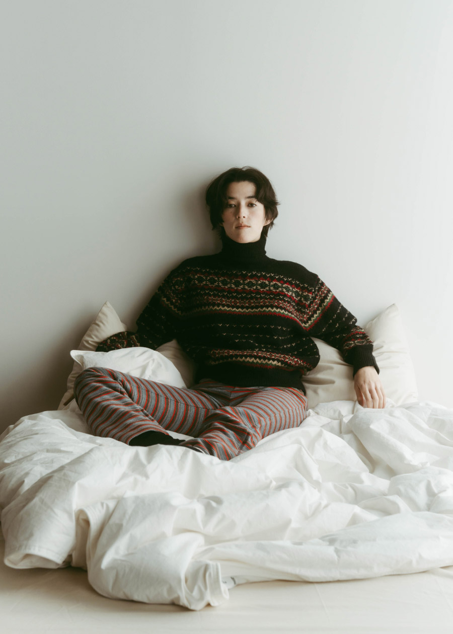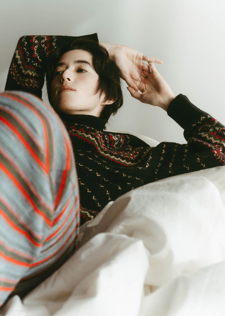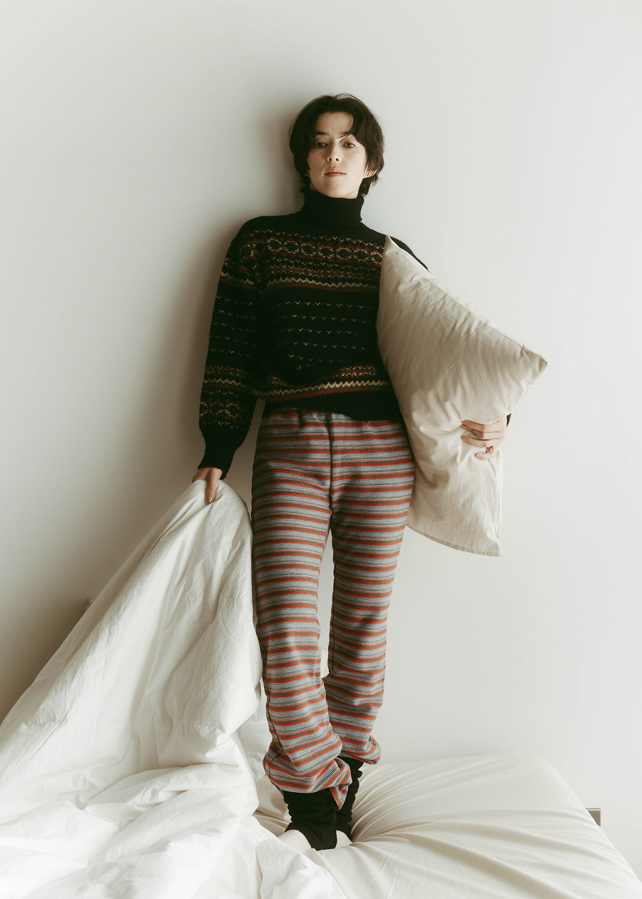 年末のきらめくシーンの代わりに、おうちで楽しむ、ちょっと特別なニットスタイル。やわらかなジャカードセーターを主役に、カラフルなボーダーパンツを合わせて遊び心のあるスタイルを。柄×柄コーデも、落ち着いた色味でまとめれば、センスのあるホームウェアが完成。