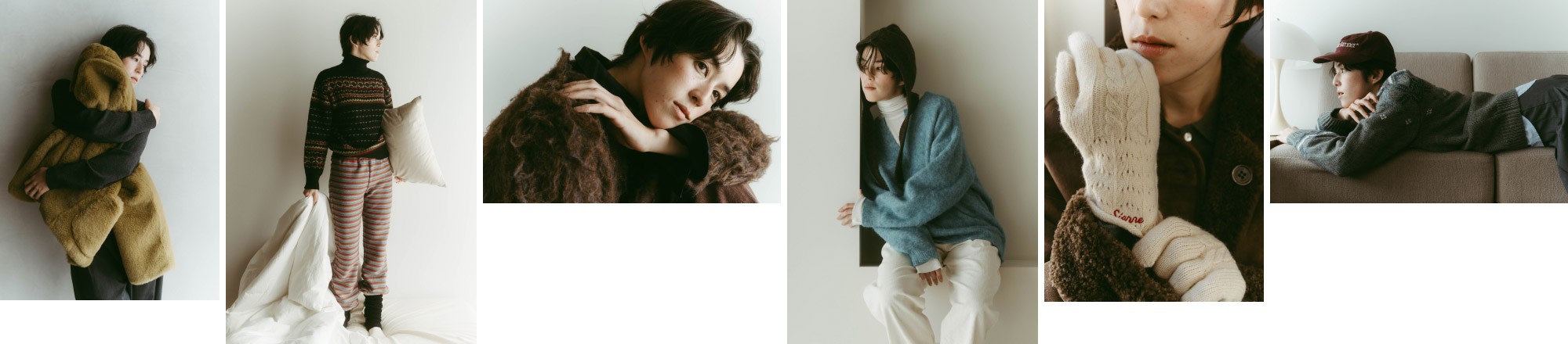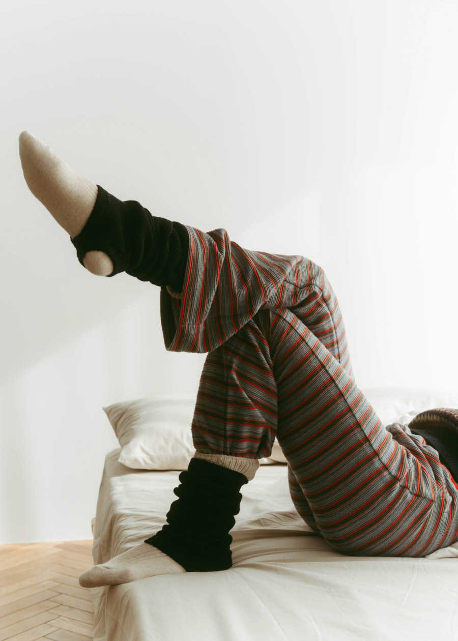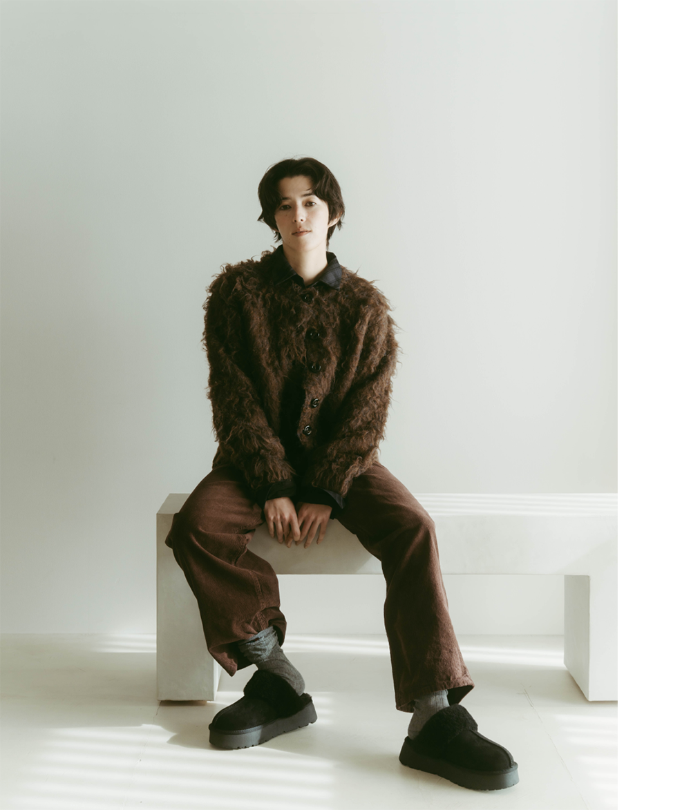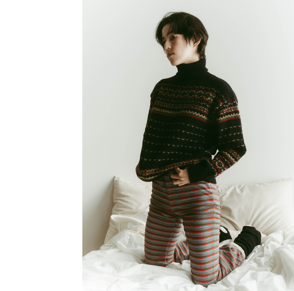年末のきらめくシーンの代わりに、おうちで楽しむ、ちょっと特別なニットスタイル。やわらかなジャカードセーターを主役に、カラフルなボーダーパンツを合わせて遊び心のあるスタイルを。柄×柄コーデも、落ち着いた色味でまとめれば、センスのあるホームウェアが完成。