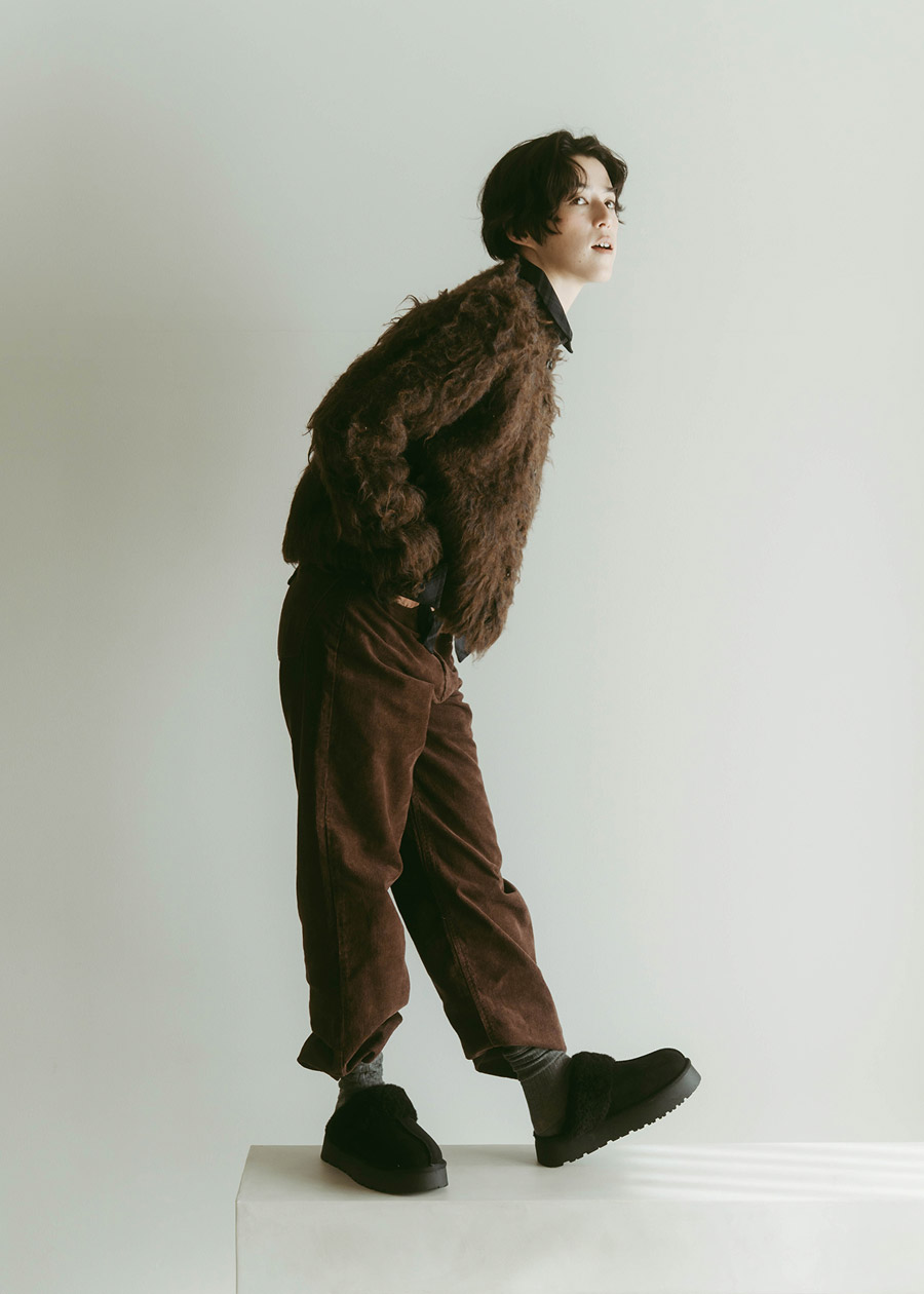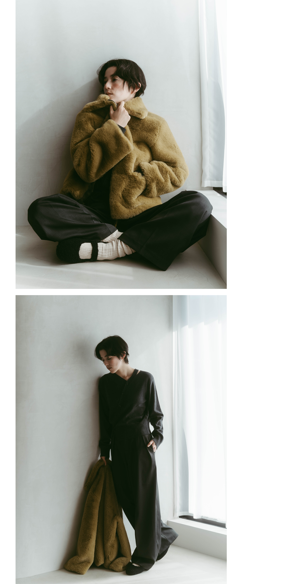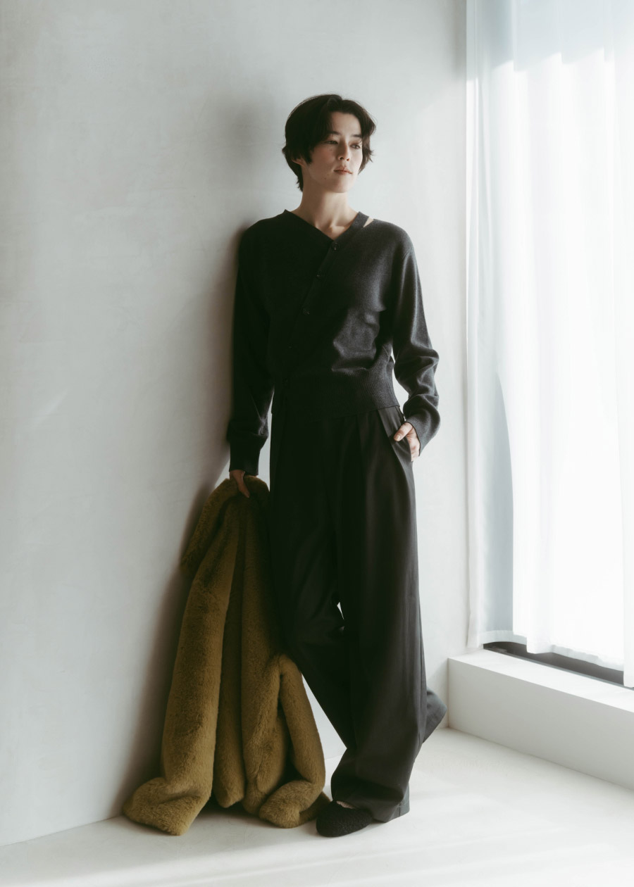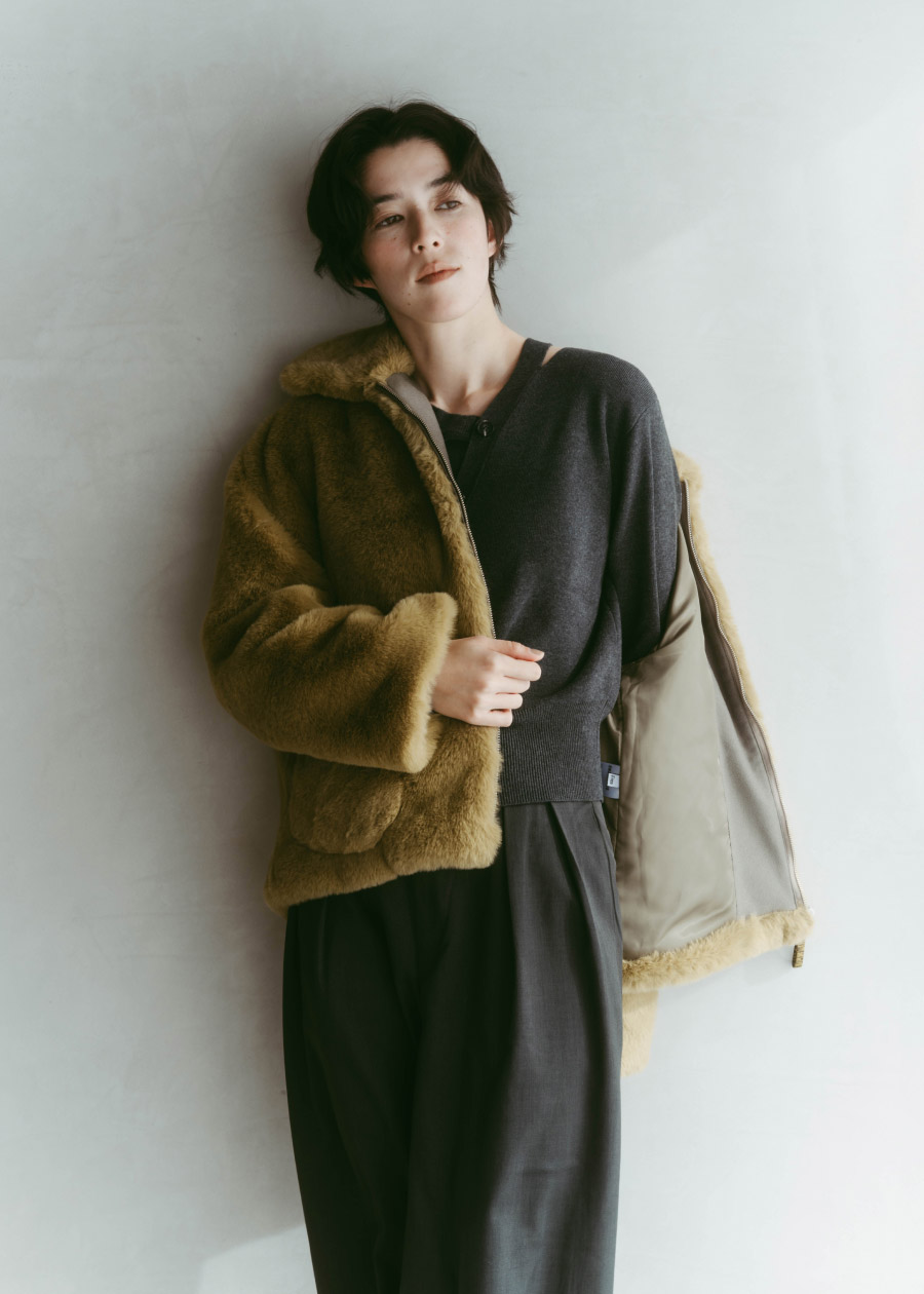 ふんわりとしたファージャケットと女性らしいスリットがポイントのニットを合わせて、抜け感を演出。チャコールベースのコーデにモスグリーンのファーで奥行きを与え、異素材のアイテムでコーデに立体感をプラス。ワイドスラックスとボアのメリージェーンシューズで仕上げることで、大人過ぎないおしゃれな印象に。