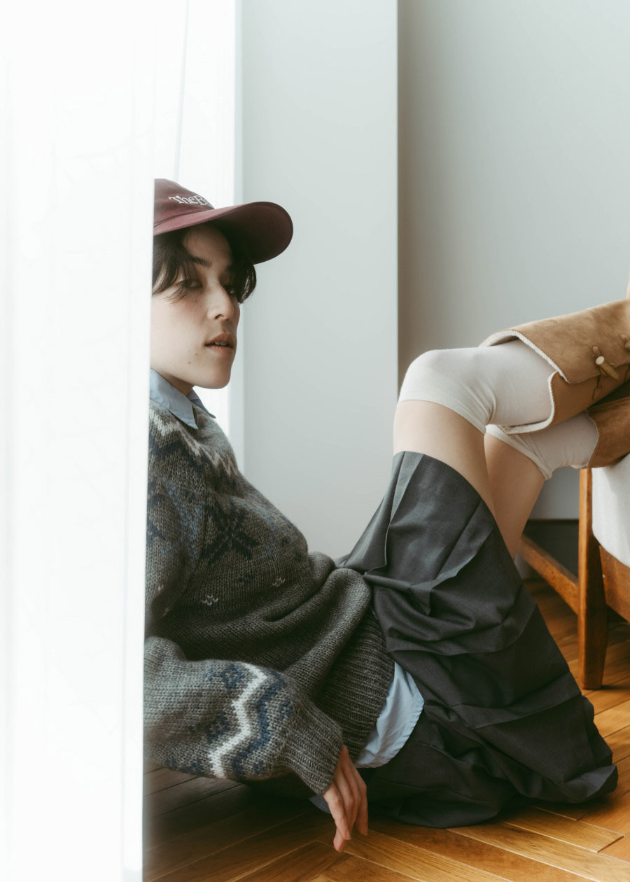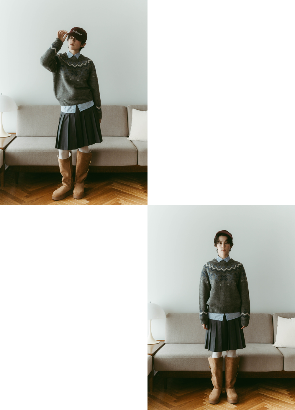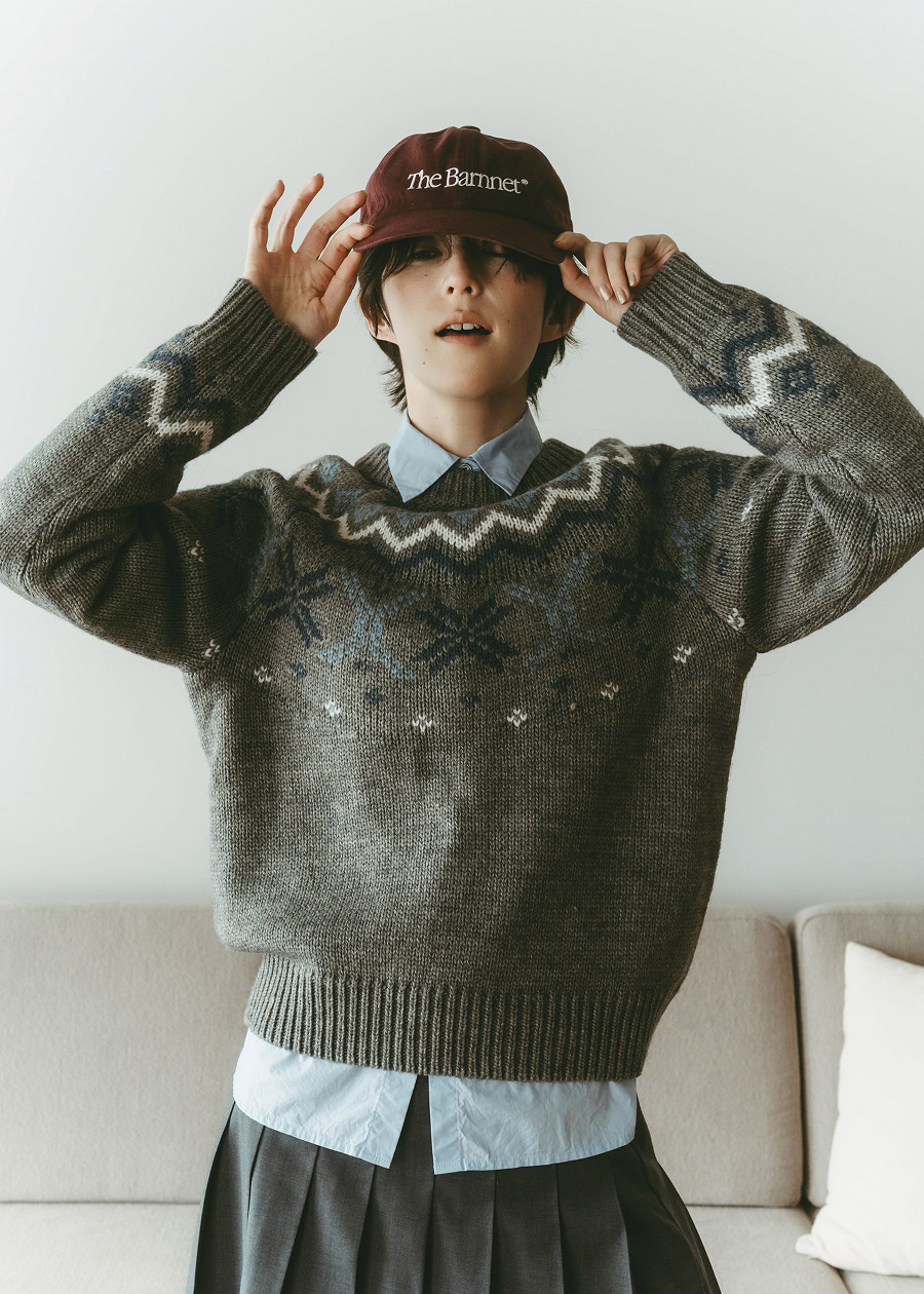 年末こそノルディック柄の出番!と思って組んだ、プレッピーコーデ。グレーのセーターに淡いブルーのシャツを重ねることで甘さを抑え、プリーツのミディスカートとベージュのロングブーツで、冬らしいスタイルが完成。ボルドーのロゴキャップが遊び心のアクセントに。
