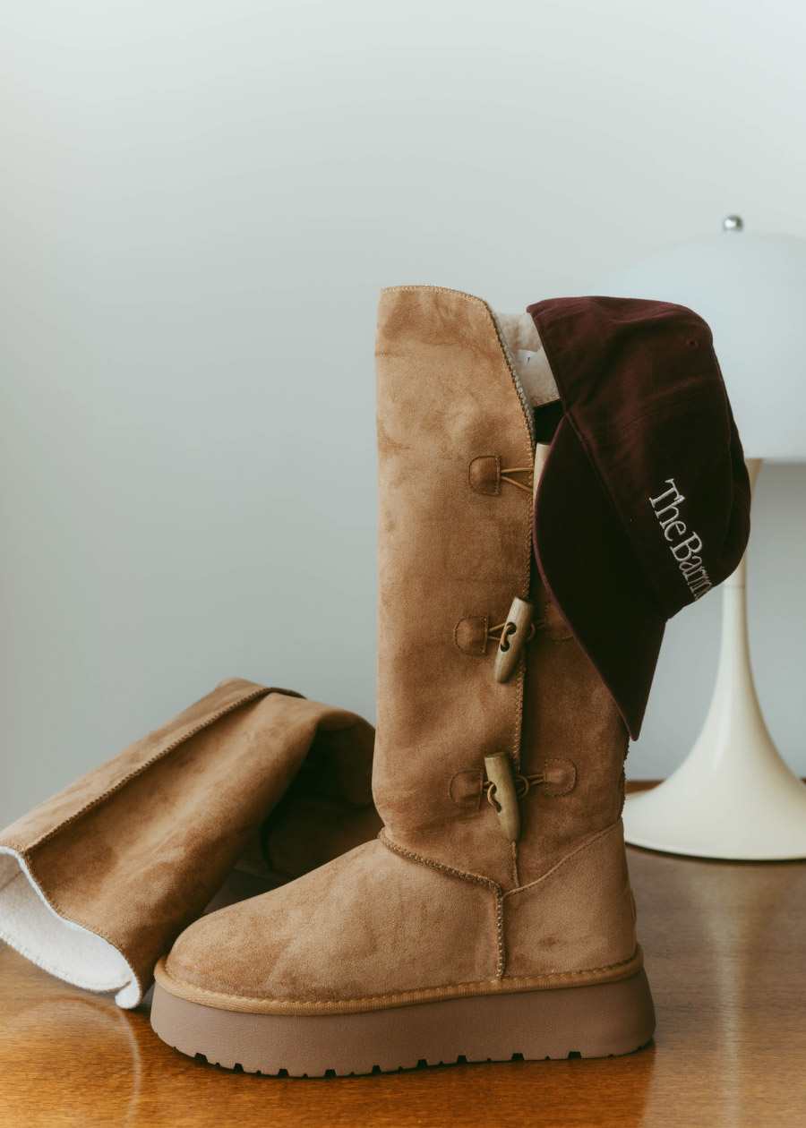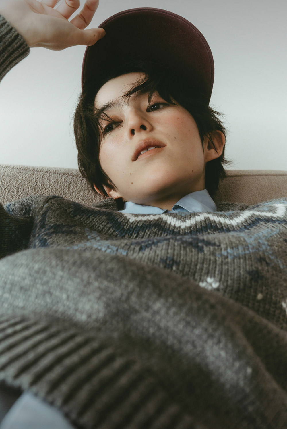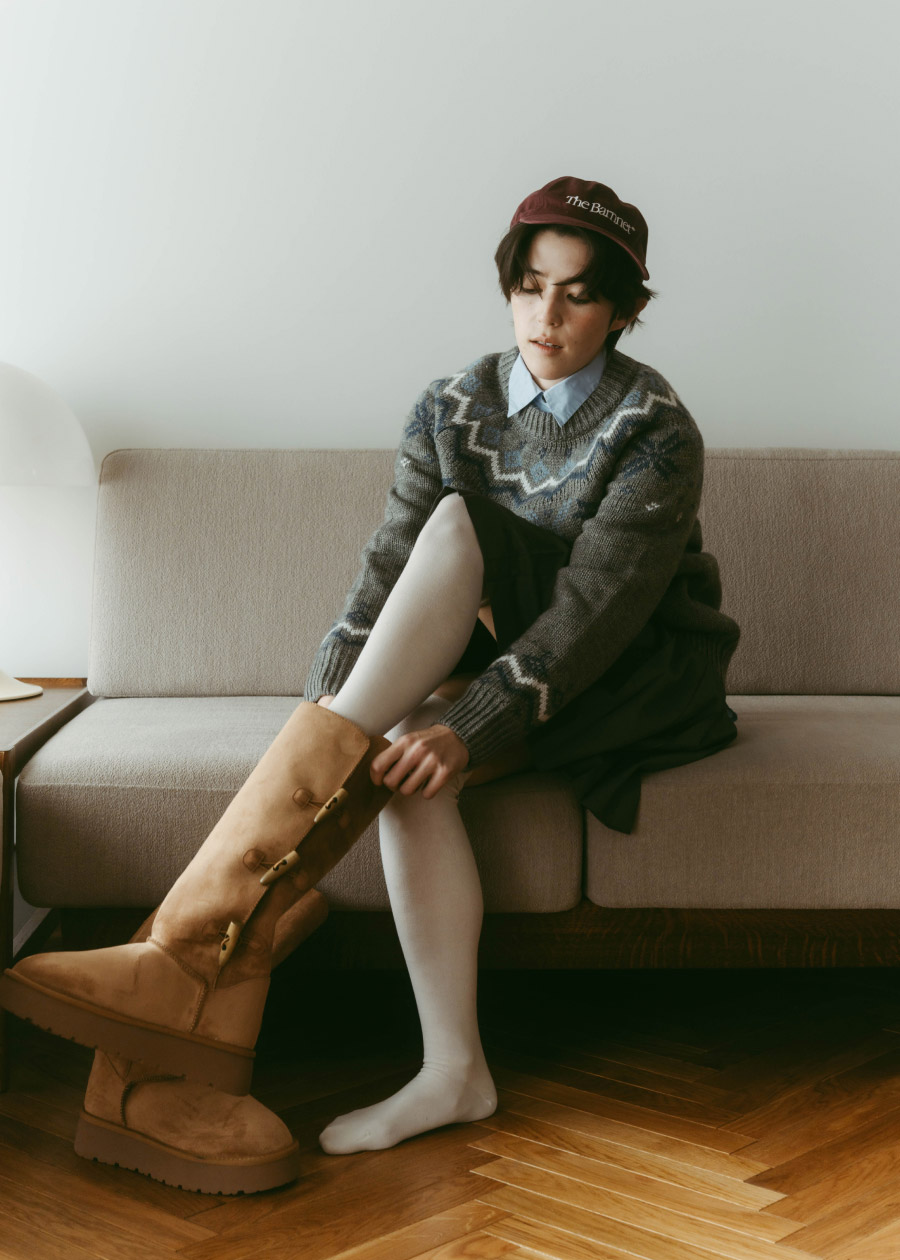 年末こそノルディック柄の出番!と思って組んだ、プレッピーコーデ。グレーのセーターに淡いブルーのシャツを重ねることで甘さを抑え、プリーツのミディスカートとベージュのロングブーツで、冬らしいスタイルが完成。ボルドーのロゴキャップが遊び心のアクセントに。