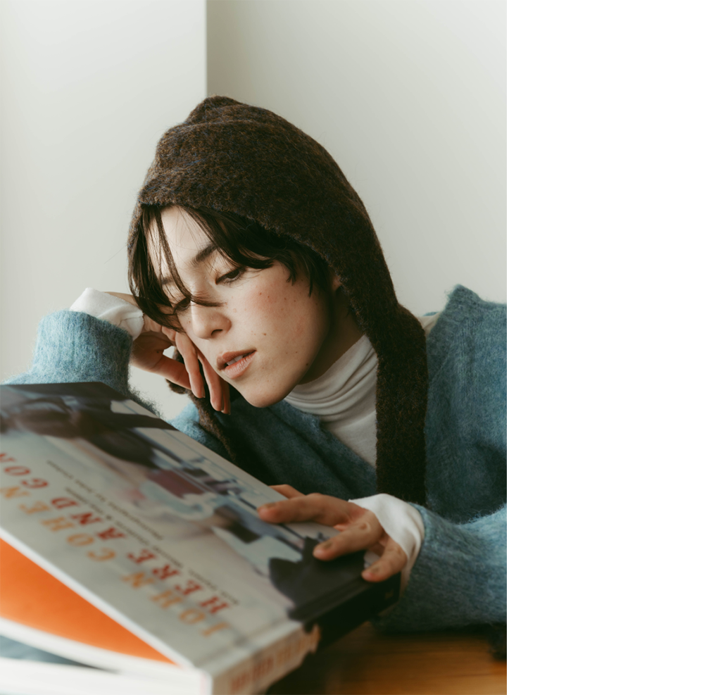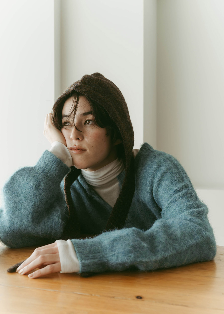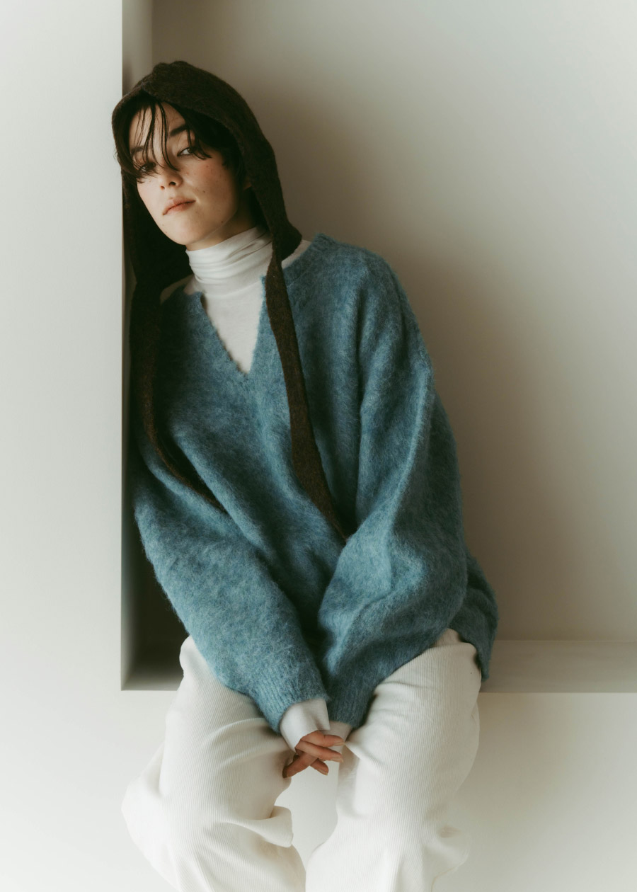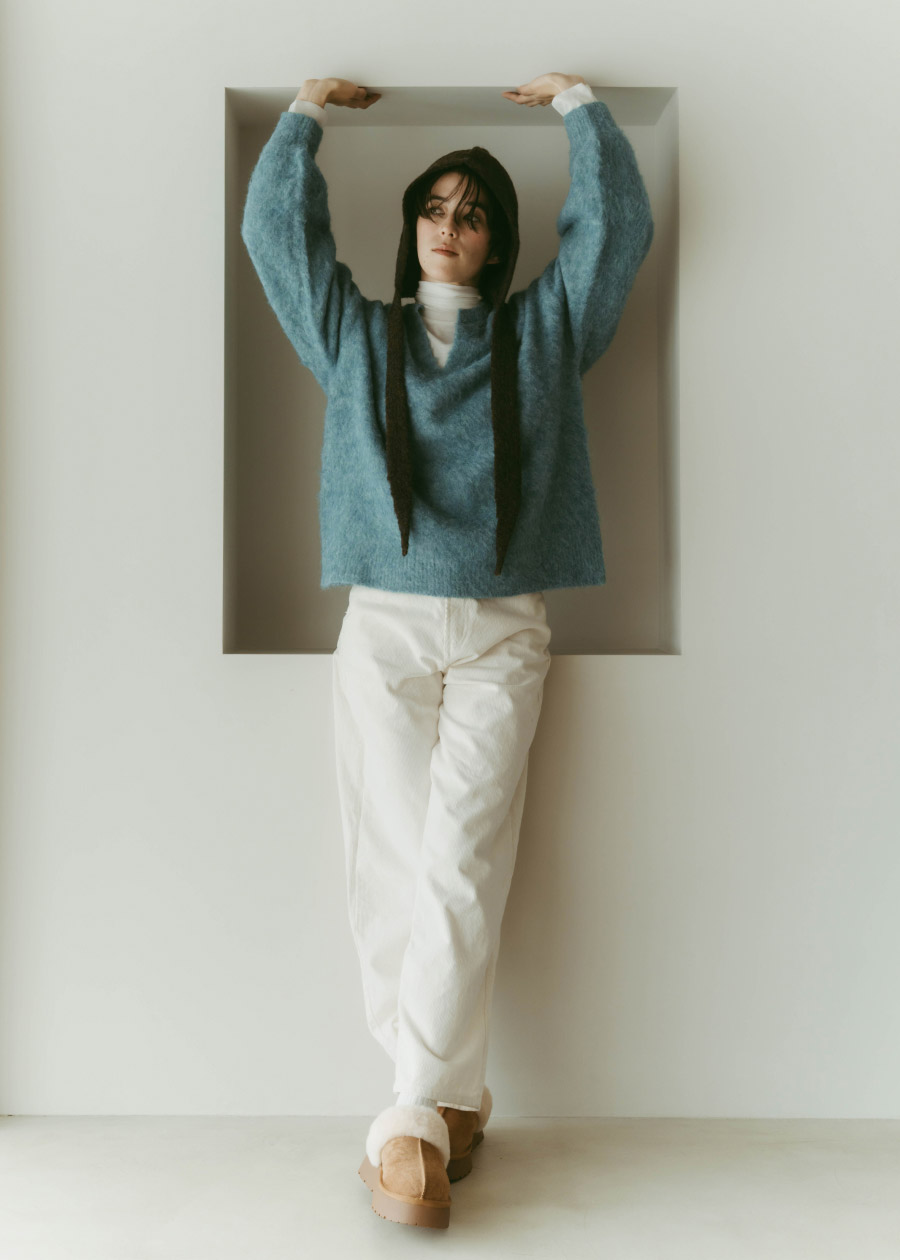 ブルーのセーターにタートルネックをレイヤード。バラクラバを取り入れ、冬の今どきスタイルが完成。コーデュロイパンツで素朴なナチュラル感に。気軽に楽しめる、冬の日常に最適な一着。