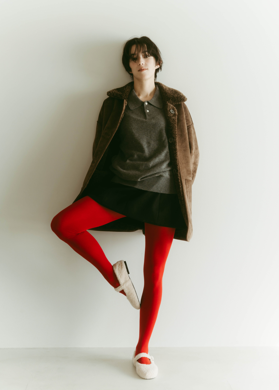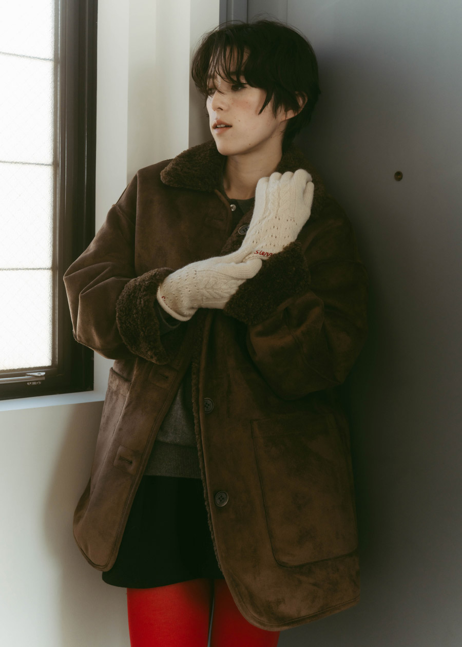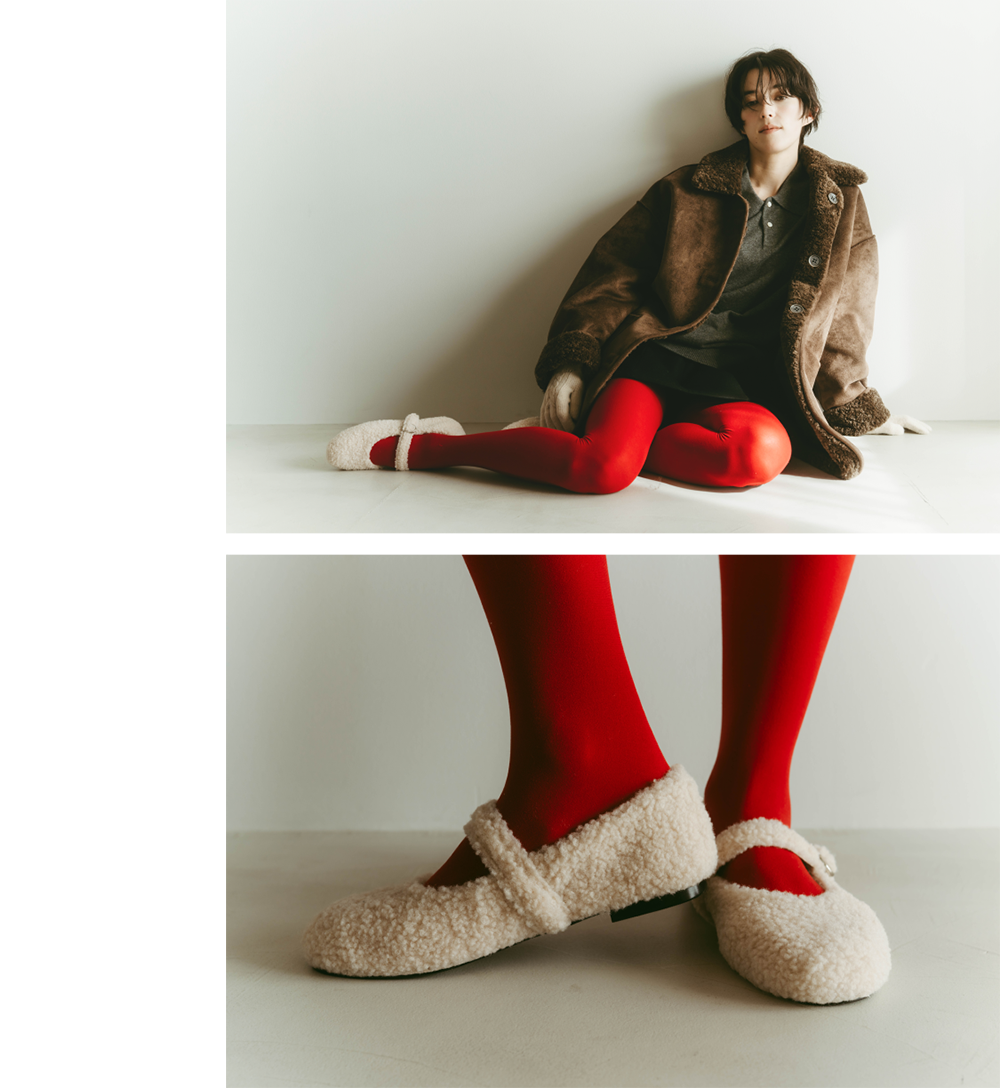 レッドを差し色して遊びを効かせた大人のスタイル。ブラウンのムートンジャケットで落ち着かせつつ、手袋の刺繍とタイツで色をリンクさせて、バランスの効いたガーリーなムードに。ボアのメリージェーンを合わせて、甘さをほんのり残した冬スタイルの完成。