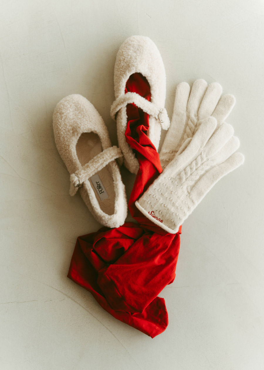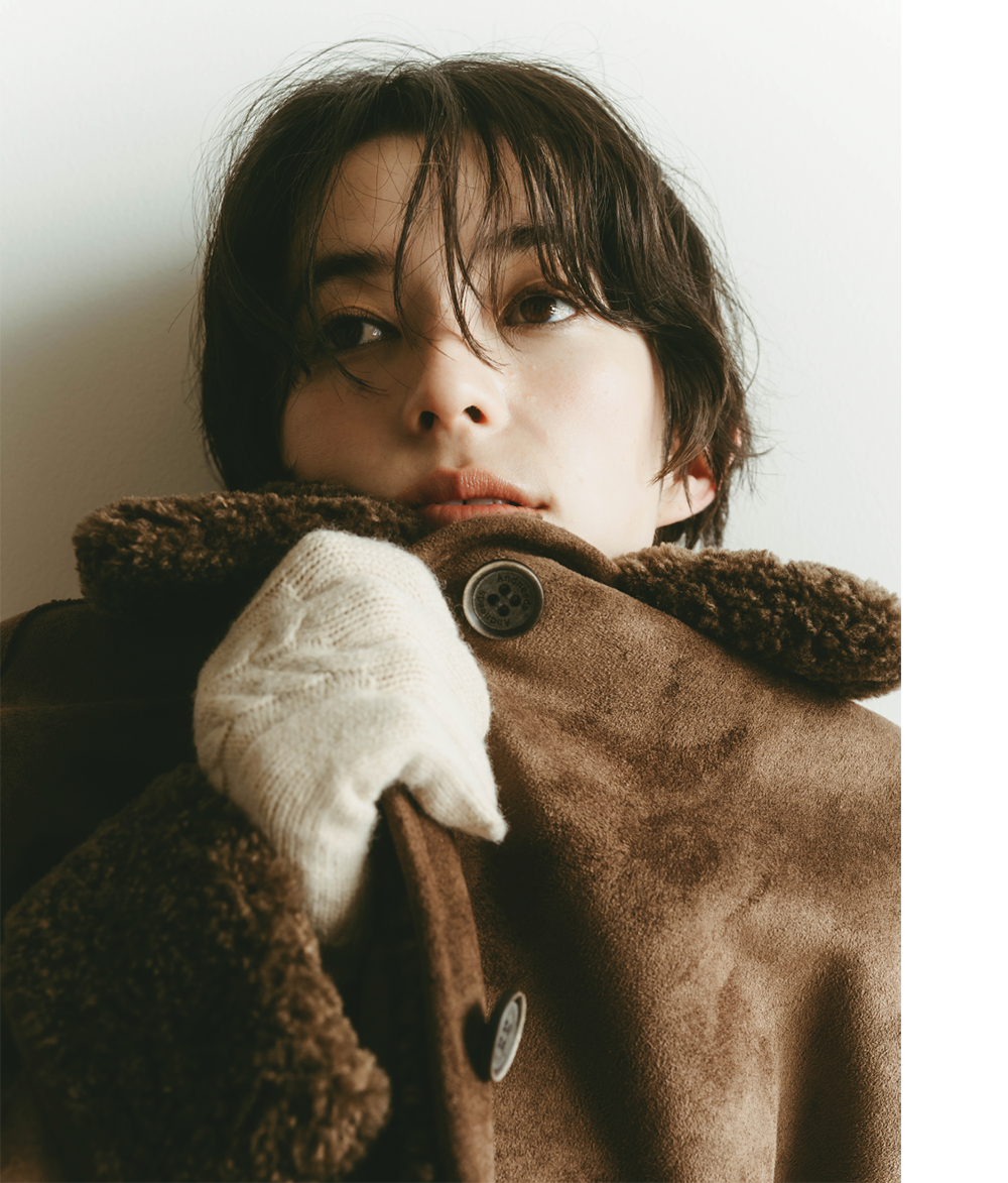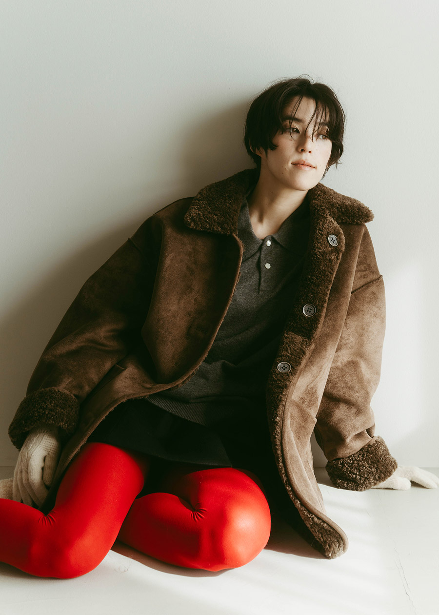 レッドを差し色して遊びを効かせた大人のスタイル。ブラウンのムートンジャケットで落ち着かせつつ、手袋の刺繍とタイツで色をリンクさせて、バランスの効いたガーリーなムードに。ボアのメリージェーンを合わせて、甘さをほんのり残した冬スタイルの完成。