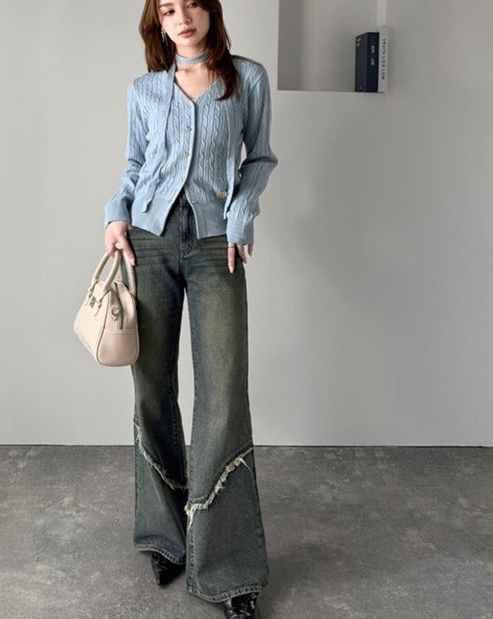 【mily bilet】ヴィンテージライクな脚盛れデニム♪ウエスタンライクフリンジダメージフレアジーンズ mi0909010